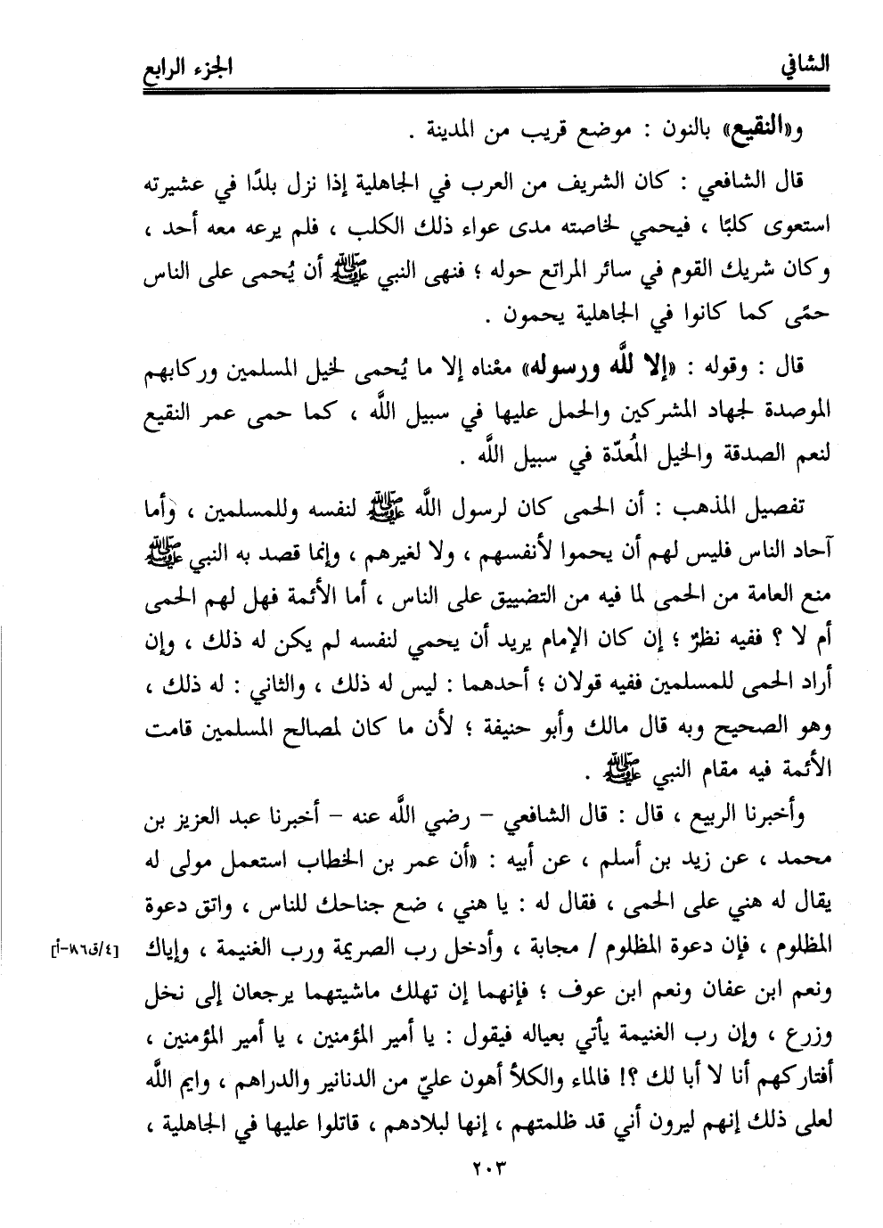 وأخبرنا الريبع، قال: قال الشافعي -رضي الله عنه- أخبرنا عبد العزيز بن محمد، عن زيد بن أسلم، عن أبيه: "أن عمر بن الخطاب استعمل مولى له يقال له هني على الحمى، فقال له: يا هني، ضع جناحك للناس، واتق دعوة المظلوم، فإن دعوة المظلوم مجابة، وأدخل رب الصريمة ورب الغنيمة، وإياك ونعم ابن عفان ونعم ابن عوف؛ فإنهما إن تهلك ماشيتهما يرجعان إلى نخل وزرع، وإن رب الغنيمة يأتي بعياله فيقول: يا أمير المؤمنين، يا أمير المؤمنين، أفتاركهم أنا لا أبا لك؟! فالماء والكلأ أهون عليّ من الدنانير والدراهم، وايم الله لعلى ذلك إنهم ليرون أني قد ظلمتهم، إنها لبلادهم، قاتلوا عليها في الجاهلية،