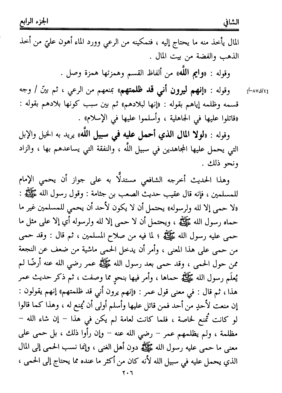 وهذا الحديث أخرجه الشافعي مستدلًّا به على جواز أن يحمي الإمام للمسلمين، فإنه قال عقيب حديث الصعب بن جثامة: وقول رسول الله - صلى الله عليه وسلم -: "لا حمى إلا لله ولرسوله" يحتمل أن لا يكون لأحد أن يحمي للمسلمين غير ما حماه رسول الله - صلى الله عليه وسلم -، ويحتمل أن لا حمى إلا لله ولرسوله أي إلا على مثل ما حمى عليه رسول الله - صلى الله عليه وسلم -؛ لما فيه من صلاح المسلمين، ثم قال: وقد حمى من حمى على هذا المعنى، وأمر أن يدخل الحمى ماشية من ضعف عن النجعة ممن حول الحمى، وقد حمى بعد رسول الله - صلى الله عليه وسلم - عمر -رضي الله عنه- أرضًا لم يُعلَم رسول الله - صلى الله عليه وسلم - حماها، وأمر فيها بنحوٍ مما وصفت، ثم ذكر حديث عمر هذا، ثم قال: في معنى قول عمر: "إنهم يرون أني قد ظلمتهم" إنهم يقولون: إن منعت لأحدٍ من أحد فمن قاتل عليها وأسلم أولى أن يُمنع له، وهذا كما قالوا لو كانت تُمنع لخاصة، فلما كانت لعامة لم يكن في هذا -إن شاء الله- مظلمة، ولم يظلمهم عمر -رضي الله عنه- وإن رأوا ذلك، بل حمى على معنى ما حمى عليه رسول الله - صلى الله عليه وسلم - دون أهل الغنى، وإنما نسب الحمى إلى المال الذي يحمل عليه في سبيل الله لأنه كما من أكثر ما عنده مما يحتاج إلى الحمى،
