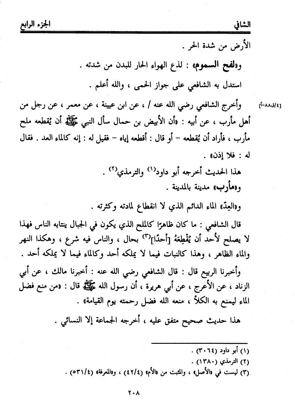 وأخرج الشافعي -رضي الله عنه-، عن ابن عيينة، عن معمر، عن رجل من أهل مأرب، عن أبيه: "أن الأبيض بن حمال سأل النبي - صلى الله عليه وسلم - أن يُقطعه ملح مأرب، فأراد أن يُقطعه -أو قال: أقطعه إياه- فقيل له: إنه كالماء العد. فقال له: فلا إذن".