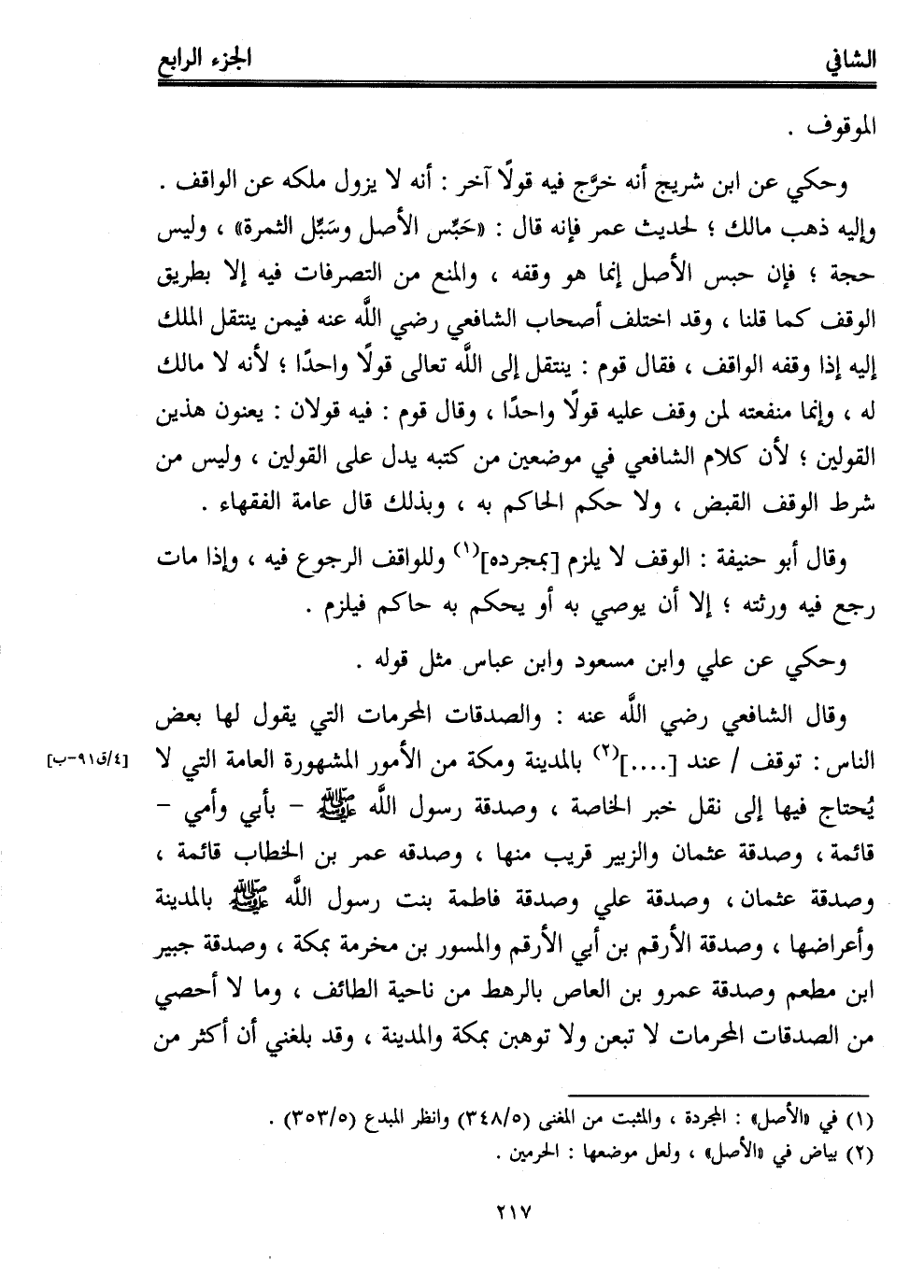 وقال الشافعي -رضي الله عنه-: والصدقات المحرمات التي يقول لها بعض الناس: توقف عند [....] (¬2) بالمدينة ومكة من الأمور المشهورة العامة التي لا يُحتاج فيها إلى نقل خبر الخاصة، وصدقة رسول الله - صلى الله عليه وسلم - -بأبي وأمي- قائمة، وصدقة عثمان والزبير قريب منها، وصدقه عمر بن الخطاب قائمة، وصدقة عثمان، وصدقة علي وصدقة فاطمة بنت رسول الله - صلى الله عليه وسلم - بالمدينة وأعراضها، وصدقة الأرقم بن أبي الأرقم والمسور بن مخرمة بمكة، وصدقة جبير ابن مطعم وصدقة عمرو بن العاص بالرهط من ناحية الطائف، وما لا أحصي من الصدقات المحرمات لا تبعن ولا توهبن بمكة والمدينة، وقد بلغني أن أكثر من
