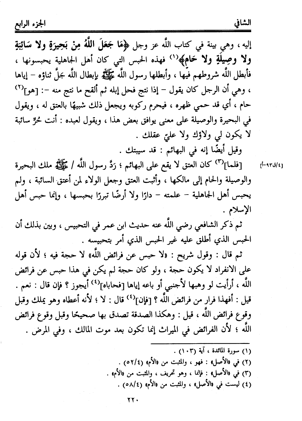 إليه، وهي بينة في كتاب الله عز وجل {مَا جَعَلَ الله مِنْ بَحِيرَةٍ وَلَا سَائِبَةٍ وَلَا وَصِيلَةٍ وَلَا حَامٍ} (¬1) فهذه الحبس التي كان أهل الجاهلية يحبسونها، فأبطل الله شروطهم فيها، وأبطلها رسول الله - صلى الله عليه وسلم - بإبطال الله جَلَّ ثناؤه -إياها، وهي أن الرجل كان يقول -إذا نتج فحل إبله ثم ألقح ما نتج منه-: [هو] (¬2) حام، أي قد حمي ظهره، فيحرم ركوبه ويجعل ذلك شبيهًا بالعتق له، ويقول في البحيرة والوصيلة على معنى يوافق بعض هذا، ويقول لعبده: أنت حُرٌّ سائبة لا يكون لي ولاؤك ولا عليّ عقلك.