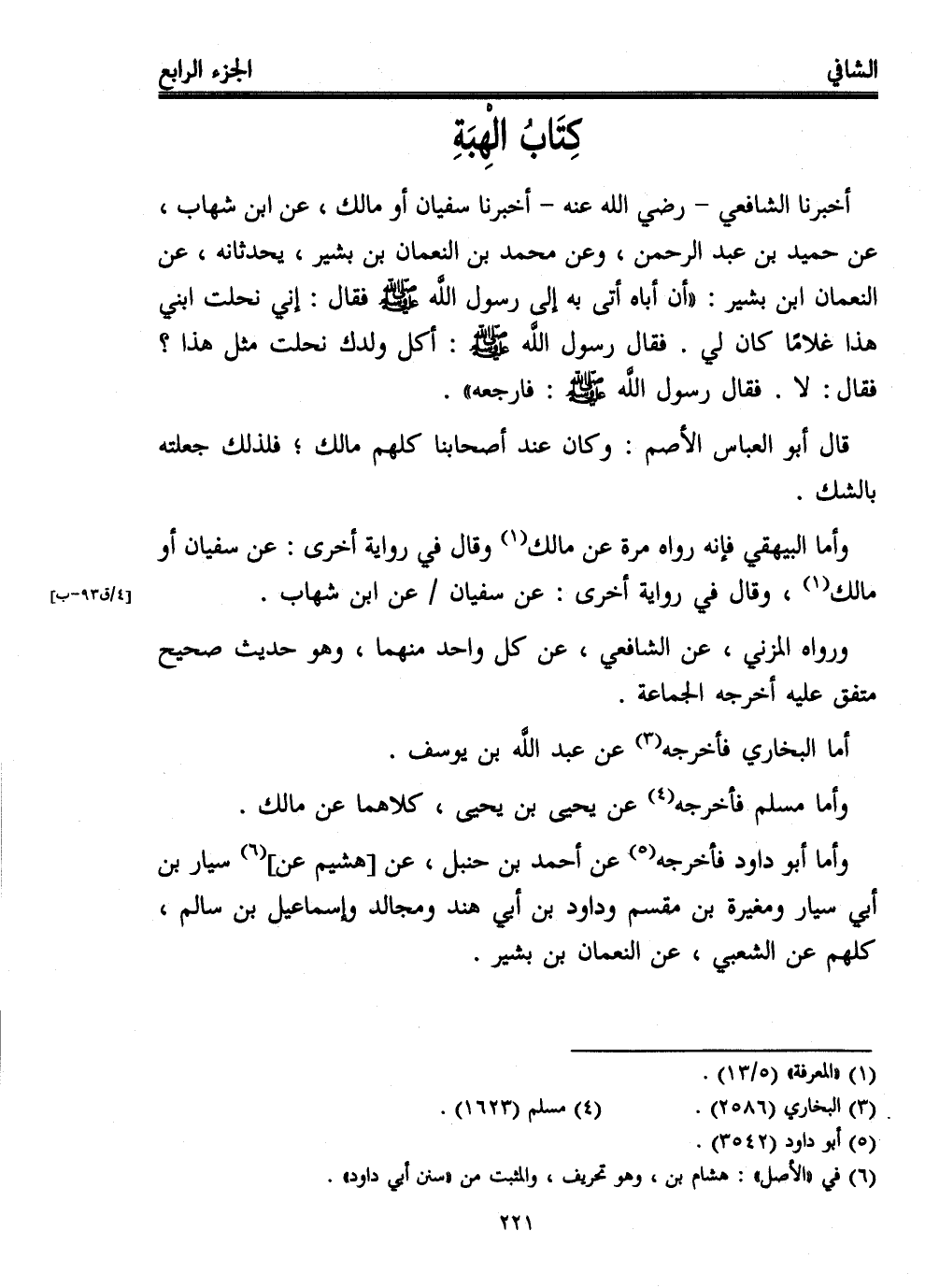 أخبرنا الشافعي -رضي الله عنه- أخبرنا سفيان أو مالك، عن ابن شهاب، عن حميد بن عبد الرحمن، وعن محمد بن النعمان بن بشير، يحدثانه، عن النعمان ابن بشير: "أن أباه أتى به إلى رسول الله - صلى الله عليه وسلم - فقال: إني نحلت ابني هذا غلامًا كان لي. فقال رسول الله - صلى الله عليه وسلم -: أكل ولدك نحلت مثل هذا؟ فقال: لا. فقال رسول الله - صلى الله عليه وسلم -: فارجعه".