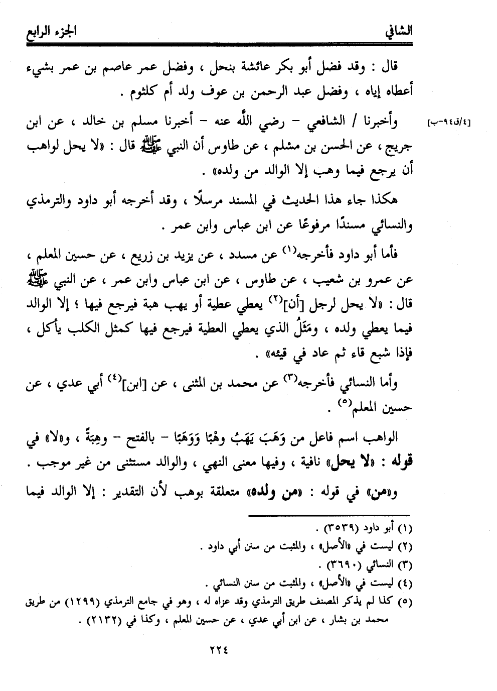 وأخبرنا الشافعي -رضي الله عنه- أخبرنا مسلم بن خالد، عن ابن جريج، عن الحسن بن مسْلم، عن طاوس أن النبي - صلى الله عليه وسلم - قال: "لا يحل لواهب أن يرجع فيما وهب إلا الوالد من ولده".