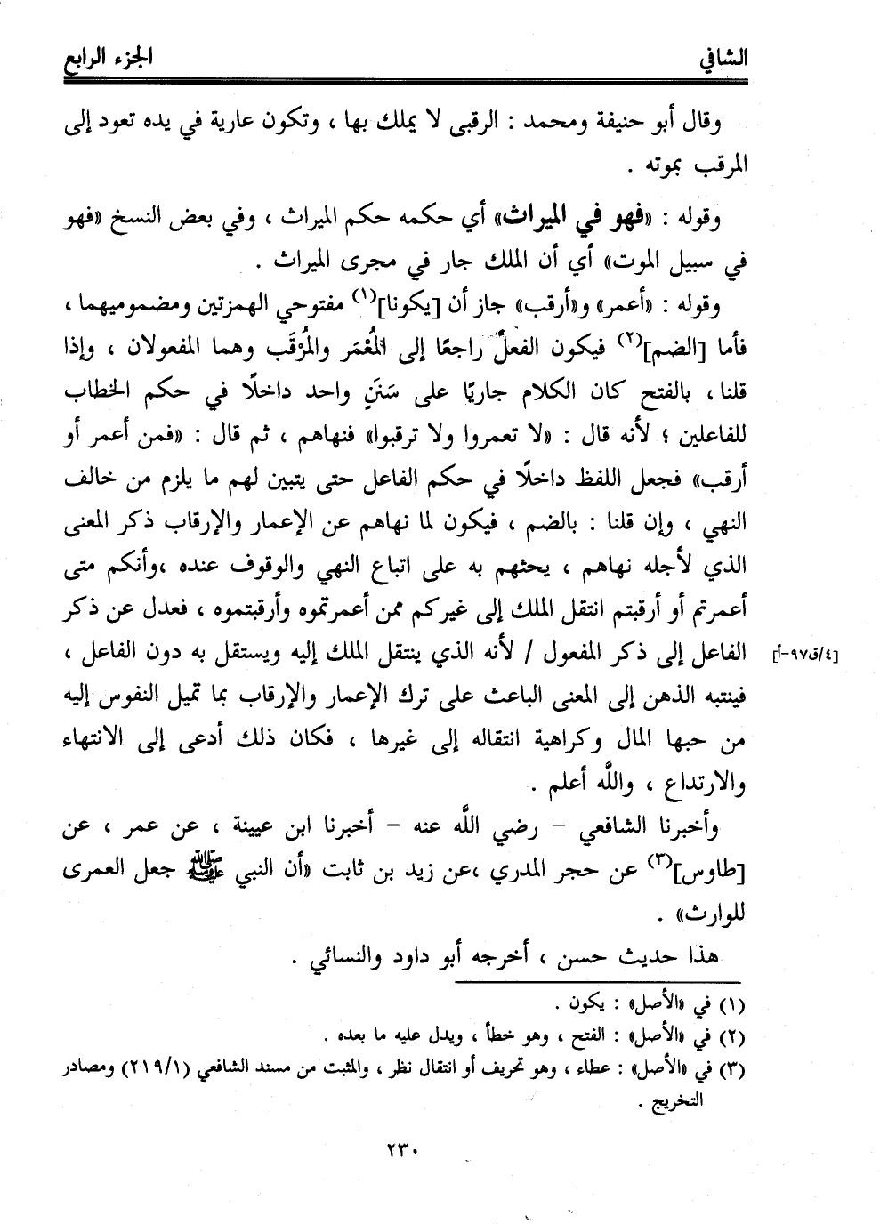 وأخبرنا الشافعي -رضي الله عنه- أخبرنا ابن عيينة، عن عمر، عن [طاوس] (¬3) عن حجر المدري، عن زيد بن ثابت "أن النبي - صلى الله عليه وسلم - جعل العمرى للوارث".