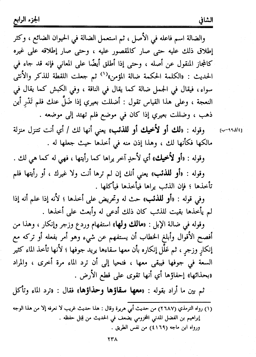 وقوله في ضالة الإبل: "مالك ولها" استفهام وردع وزجر وإنكار، وهذا من أفصح الأقوال وأبلغ الخطاب أن يستفهم عن شيء وهو أمر بفعله أو تركه مع إنكارٍ وزجرٍ، ثم عَلَّل إنكاره بأن معها سقاءها يريد جوفها؛ لأنها تأخذ الماء كثير السعة في جوفها فيبقى معها، فتحيا إلى أن ترد الماء مرة أخرى، والمراد "بحذائها" إحفاؤها أي أنها تقوى على قطع الأرض.