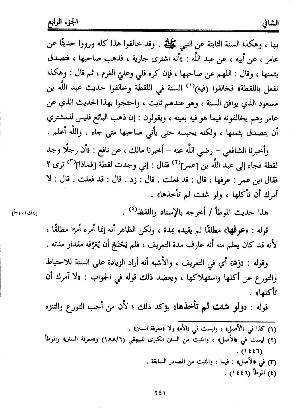 وأخبرنا الشافعي -رضي الله عنه- أخبرنا مالك، عن نافع: "أن رجلاً وجد لقطة فجاء إلى عبد الله بن [عمر] (¬2) فقال: إني وجدت لقطة [فماذا] (¬3) ترى؟ فقال ابن عمر: عرفها، قال: قد فعلت. قال: زد. قال: قد فعلت. قال: لا آمرك أن تأكلها, ولو شئت لم تأخذها".