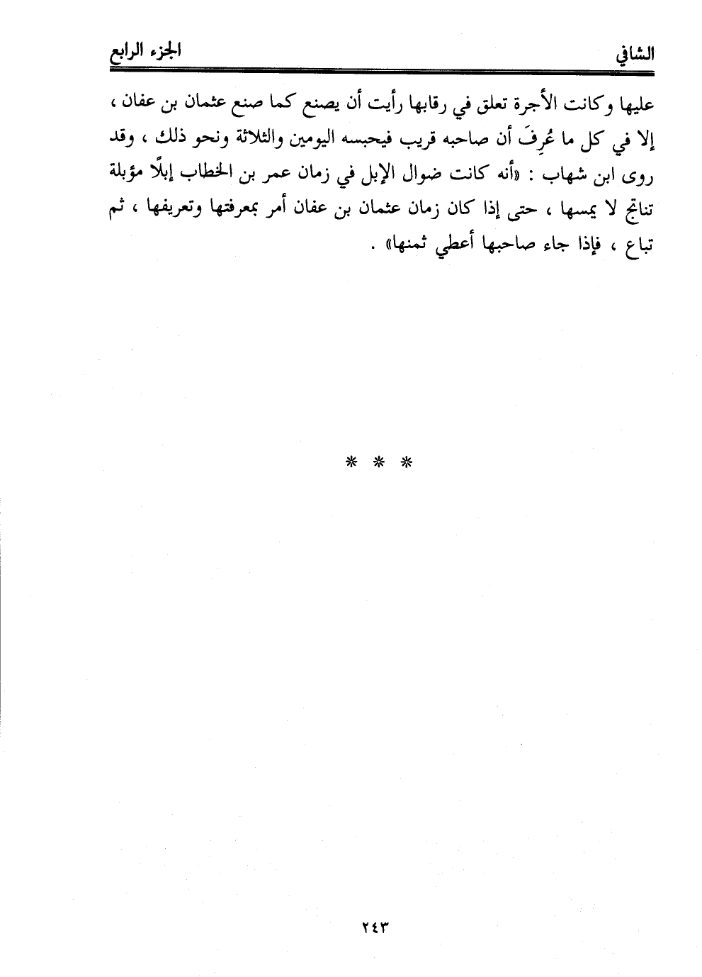 عليها وكانت الأجرة تعلق في رقابها رأيت أن يصنع كما صنع عثمان بن عفان، إلا في كل ما عُرِفَ أن صاحبه قريب فيحبسه اليومين والثلاثة ونحو ذلك، وقد روى ابن شهاب: "أنه كانت ضوال الإبل في زمان عمر بن الخطاب إبلاً مؤبلة تناتج لا يمسها، حتى إذا كان زمان عثمان بن عفان أمر بمعرفتها وتعريفها، ثم تباع، فإذا جاء صاحبها أعطي ثمنها".