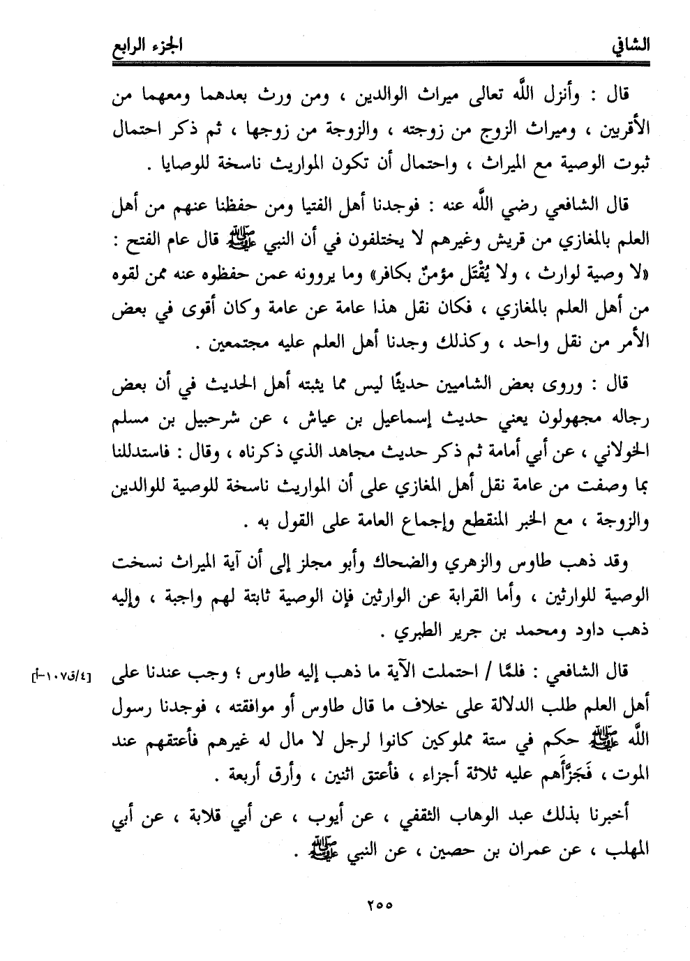 قال الشافعي: فلمَّا احتملت الآية ما ذهب إليه طاوس؛ وجب عندنا على أهل العلم طلب الدلالة على خلاف ما قال طاوس أو موافقته، فوجدنا رسول الله - صلى الله عليه وسلم - حكم في ستة مملوكين كانوا لرجل لا مال له غيرهم فأعتقهم عند الموت، فَجَزَّأَهم عليه ثلاثة أجزاء، فأعتق اثنين، وأرق أربعة.