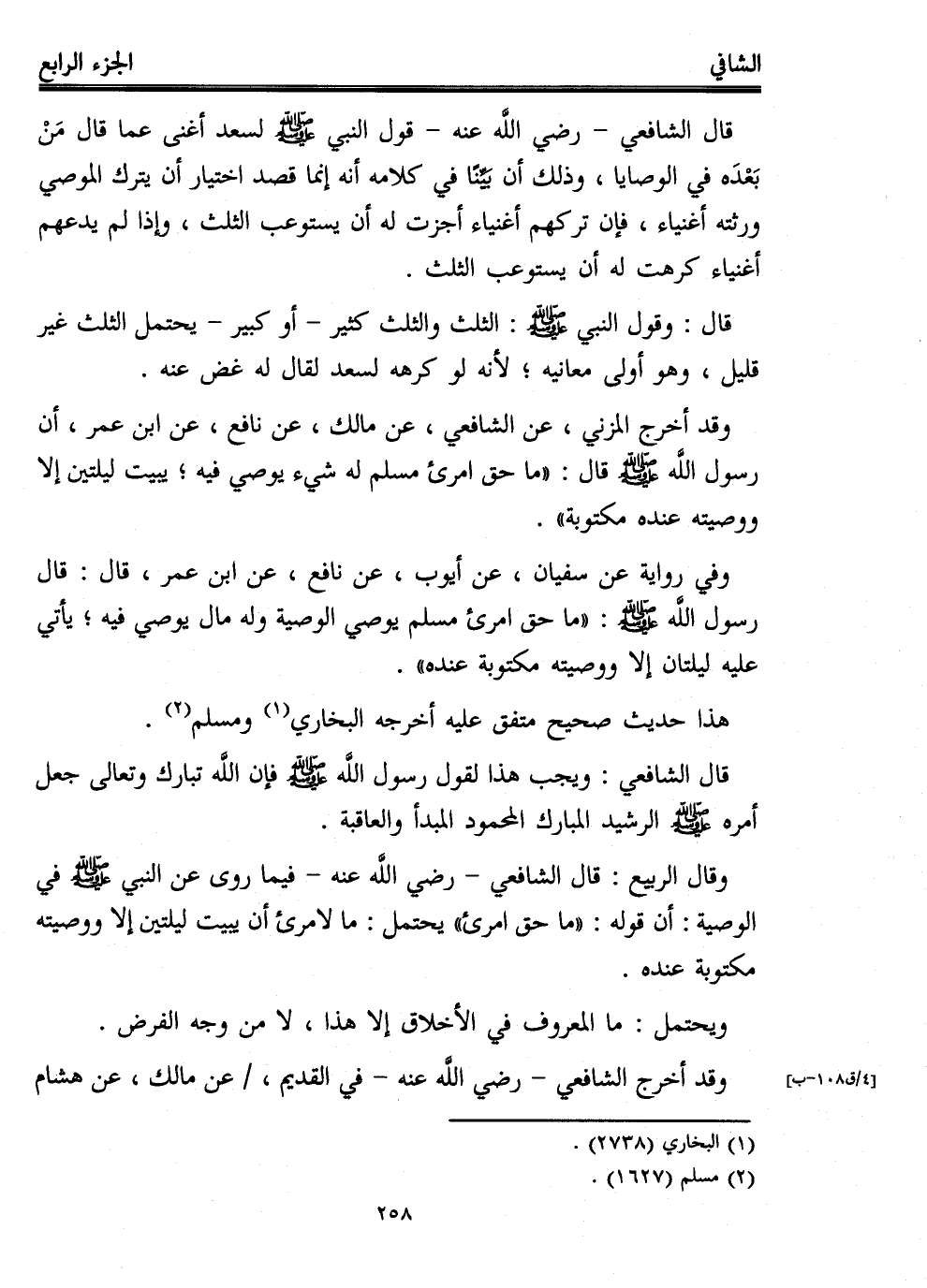 وقد أخرج المزني، عن الشافعي، عن مالك، عن نافع، عن ابن عمر، أن رسول الله - صلى الله عليه وسلم - قال: "ما حق امرئ مسلم له شيء يوصي فيه؛ يبيت ليلتين إلا ووصيته عنده مكتوبة".
