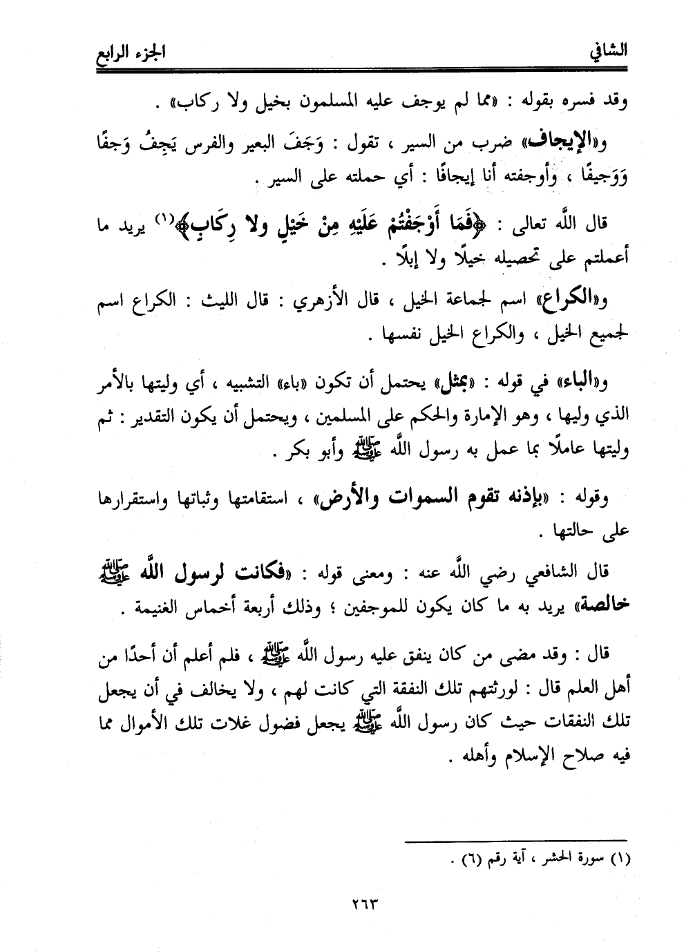 قال الشافعي -رضي الله عنه-: ومعنى قوله: "فكانت لرسول الله - صلى الله عليه وسلم - خالصة" يريد به ما كان يكون للموجفين؛ وذلك أربعة أخماس الغنيمة.