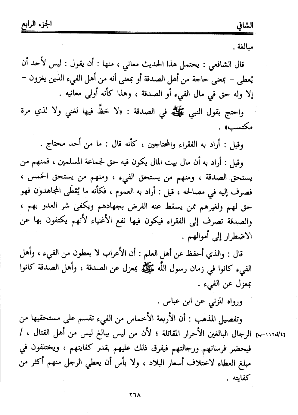 قال: والذي أحفظ عن أهل العلم: أن الأعراب لا يعطون من الفيء، وأهل الفيء كانوا في زمان رسول الله - صلى الله عليه وسلم - بمعزل عن الصدقة، وأهل الصدقة كانوا بمعزل عن الفيء.
