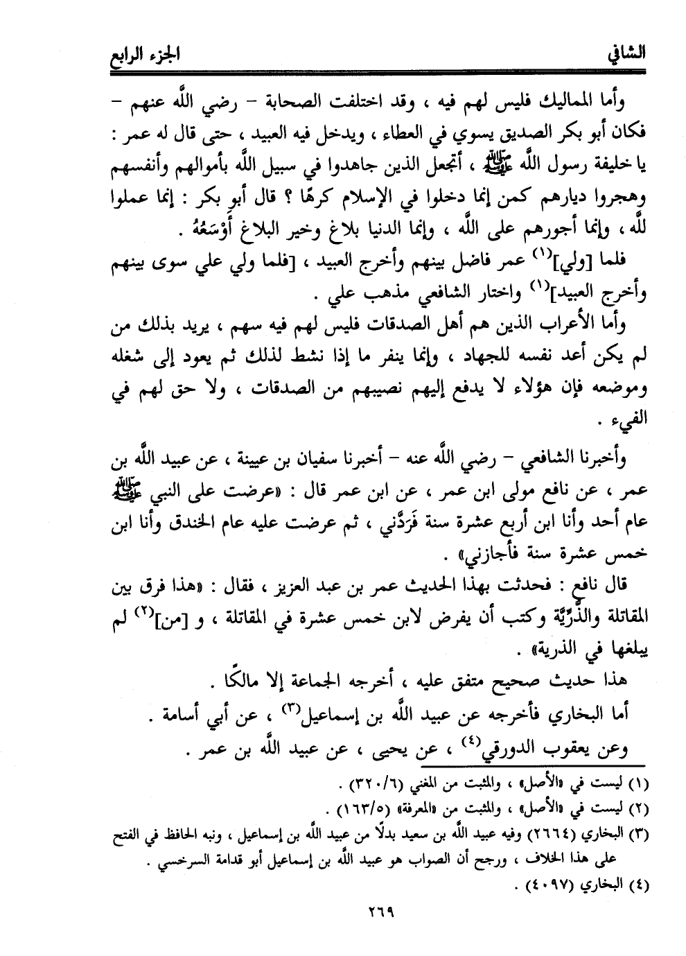 وأخبرنا الشافعي -رضي الله عنه- أخبرنا سفيان بن عيينة، عن عبيد الله بن عمر، عن نافع مولى ابن عمر، عن ابن عمر قال: "عرضت على النبي - صلى الله عليه وسلم - عام أحد وأنا ابن أربع عشرة سنة فَرَدَّني، ثم عرضت عليه عام الخندق وأنا ابن خمس عشرة سنة فأجازني".