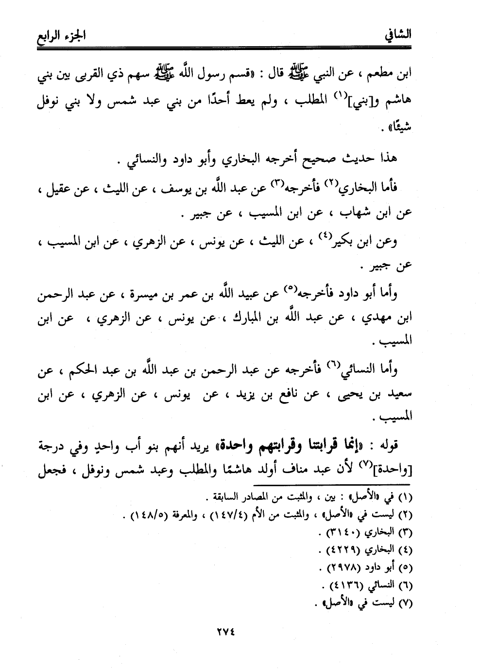 ابن مطعم، عن النبي - صلى الله عليه وسلم - قال: "قسم رسول الله - صلى الله عليه وسلم - سهم ذي القربى بين بني هاشم و [بني]، (¬1) المطلب، ولم يعط أحدًا من بني عبد شمس ولا بني نوفل شيئًا".