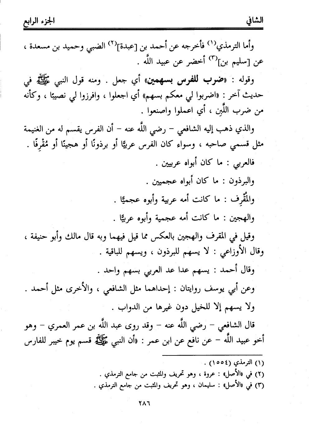 قال الشافعي -رضي الله عنه- وقد روى عبد الله بن عمر العمري -وهو أخو عبيد الله- عن نافع عن ابن عمر: "أن النبي - صلى الله عليه وسلم - قسم يوم خيبر للفارس