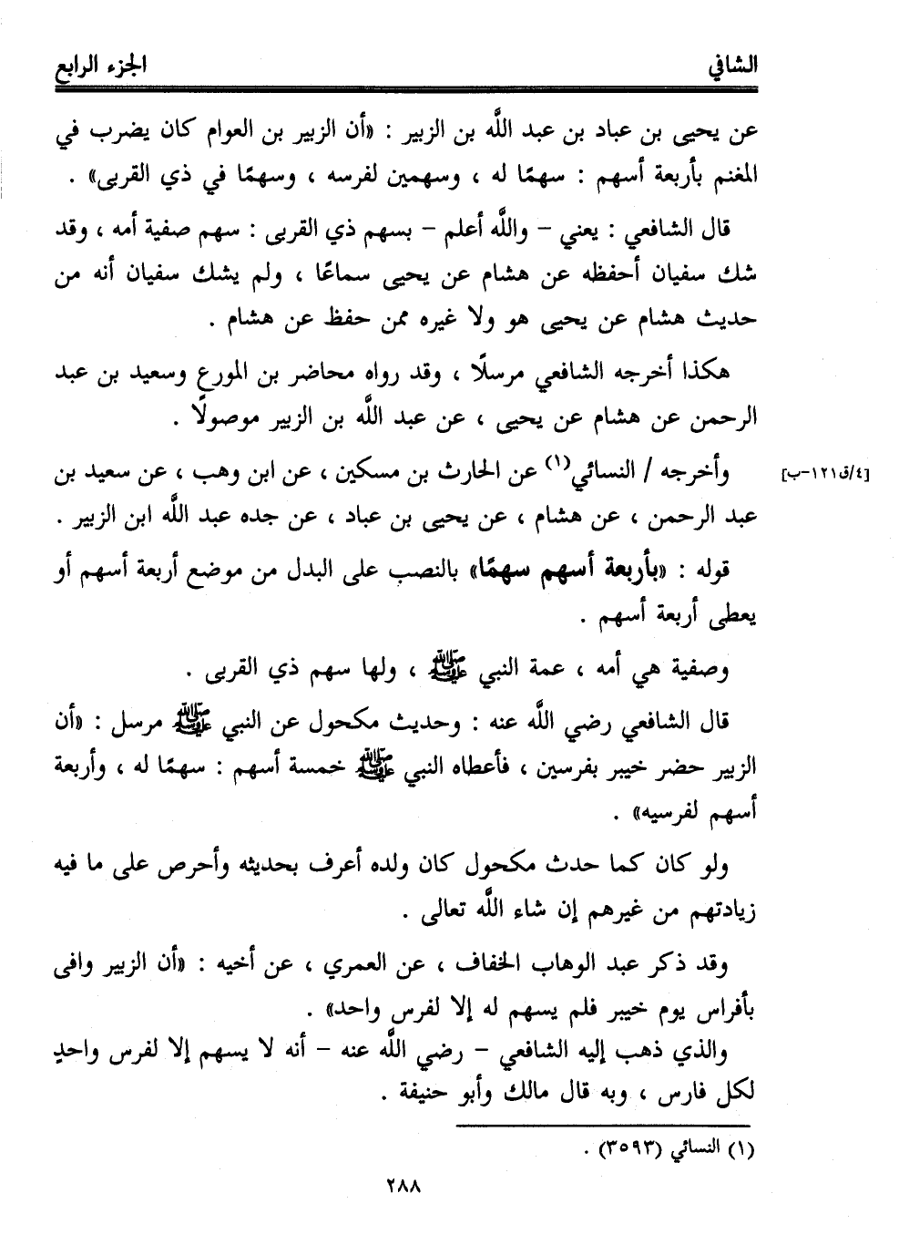 عن يحيى بن عباد بن عبد الله بن الزبير: "أن الزبير بن العوام كان يضرب في المغنم بأربعة أسهم: سهمًا له، وسهمين لفرسه، وسهمًا في ذي القربى".