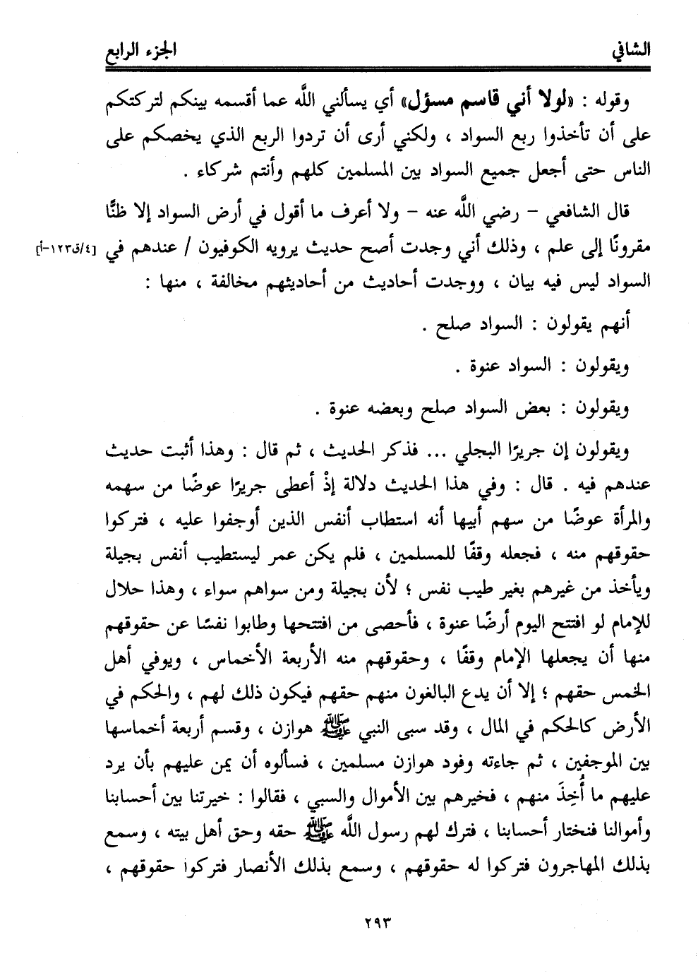 قال الشافعي -رضي الله عنه- ولا أعرف ما أقول في أرض السواد إلا ظنًّا مقرونًا إلى علم، وذلك أفي وجدت أصح حديث يرويه الكوفيون عندهم في السواد ليس فيه بيان، ووجدت أحاديث من أحاديثهم مخالفة، منها: