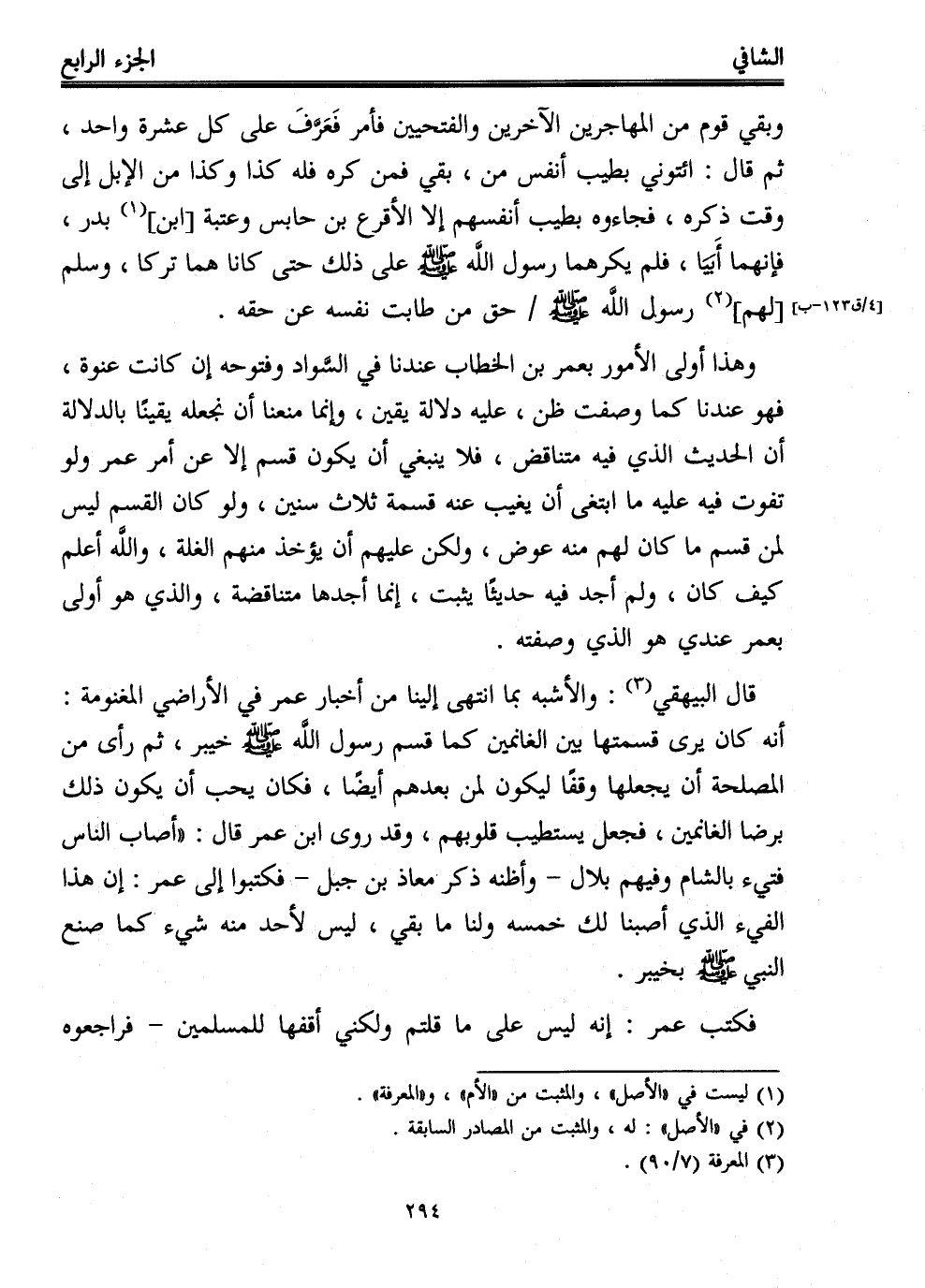 وهذا أولى الأمور بعمر بن الخطاب عندنا في السَّواد وفتوحه إن كانت عنوة فهو عندنا كما وصفت ظن، عليه دلالة يقين، وإنما منعنا أن نجعله يقينًا بالدلالة أن الحديث الذي فيه متناقض، فلا ينبغي أن يكون قسم إلا عن أمر عمر ولو تفوت فيه عليه ما ابتغى أن يغيب عنه قسمة ثلاث سنين، ولو كان القسم ليس لمن قسم ما كان لهم منه عوض، ولكن عليهم أن يؤخذ منهم الغلة، والله أعلم كيف كان، ولم أجد فيه حديثًا يثبت، إنما أجدها متناقضة، والذي هو أولى بعمر عندي هو الذي وصفته.