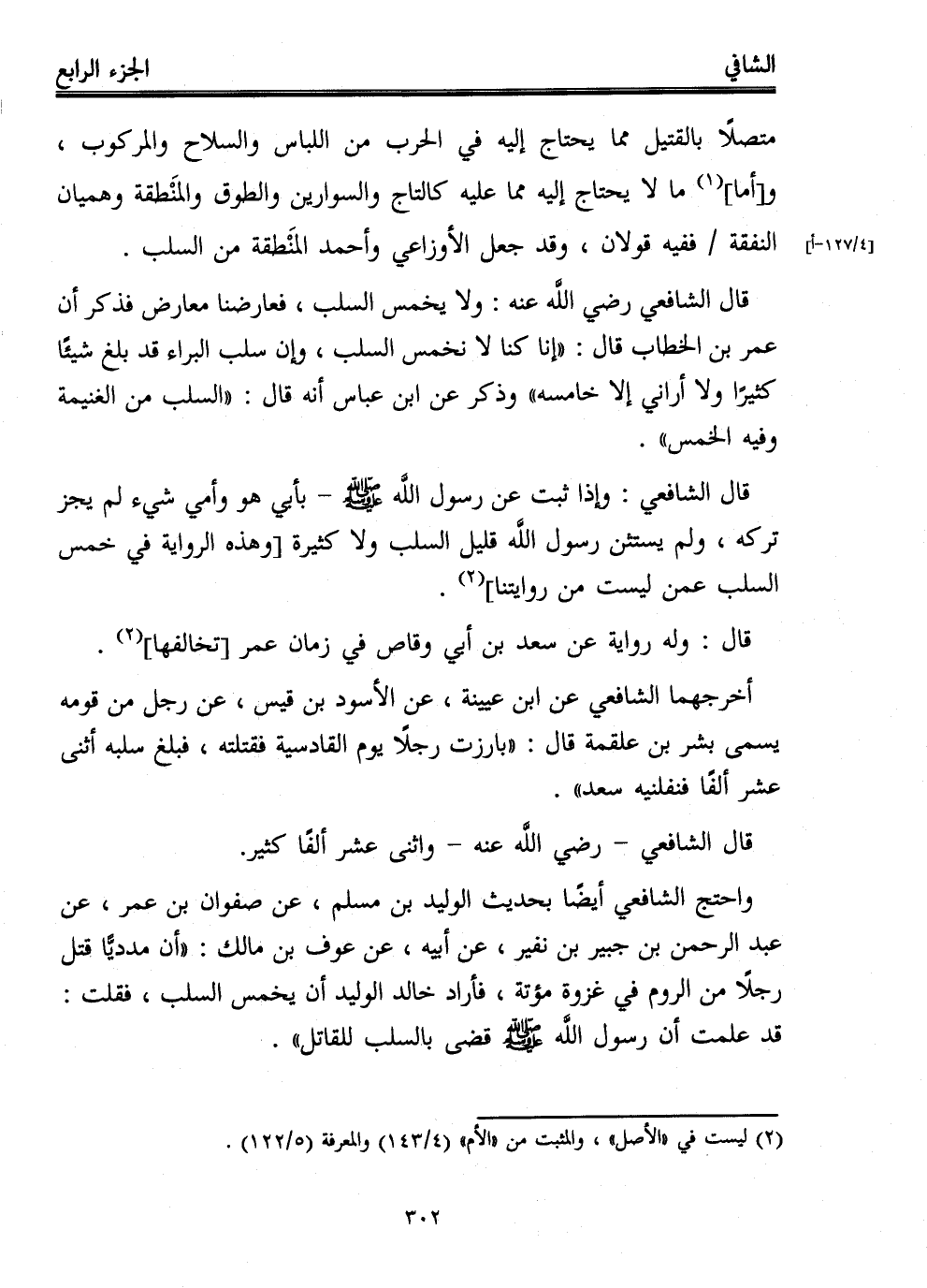 قال الشافعي -رضي الله عنه-: ولا يخمس السلب، فعارضنا معارض فذكر أن عمر بن الخطاب قال: "إنا كنا لا نخمس السلب، وإن سلب البراء قد بلغ شيئًا كثيرًا ولا أراني إلا خامسه" وذكر عن ابن عباس أنه قال: "السلب من الغنيمة وفيه الخمس".