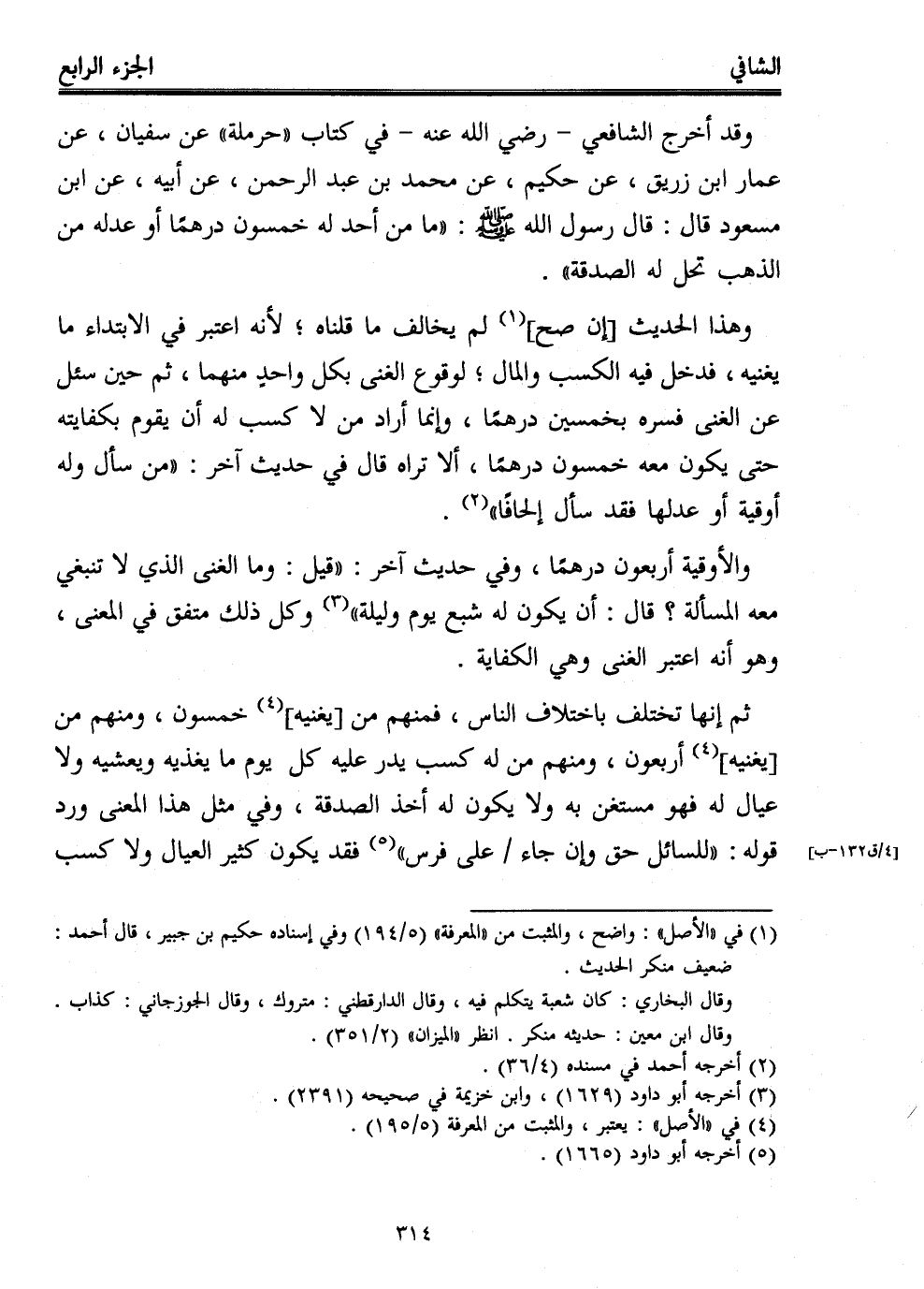 وقد أخرج الشافعي -رضي الله عنه- في كتاب "حرملة" عن سفيان، عن عمار ابن زريق، عن حكيم، عن محمد بن عبد الرحمن، عن أبيه، عن ابن مسعود قال: قال رسول الله - صلى الله عليه وسلم -: "ما من أحد له خمسون درهمًا أو عدله من الذهب تحل له الصدقة".