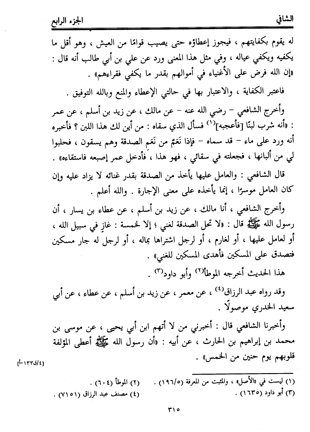 وأخرج الشافعي، أنا مالك، عن زيد بن أسلم، عن عطاء بن يسار، أن رسول الله - صلى الله عليه وسلم - قال: "لا تحل الصدقة لغني؛ إلا لخمسة: غازٍ في سبيل الله، أو لعامل عليها، أو لغارم، أو لرجل اشتراها بماله، أو لرجل له جار مسكين فتصدق على المسكين فأهدى المسكين للغني".