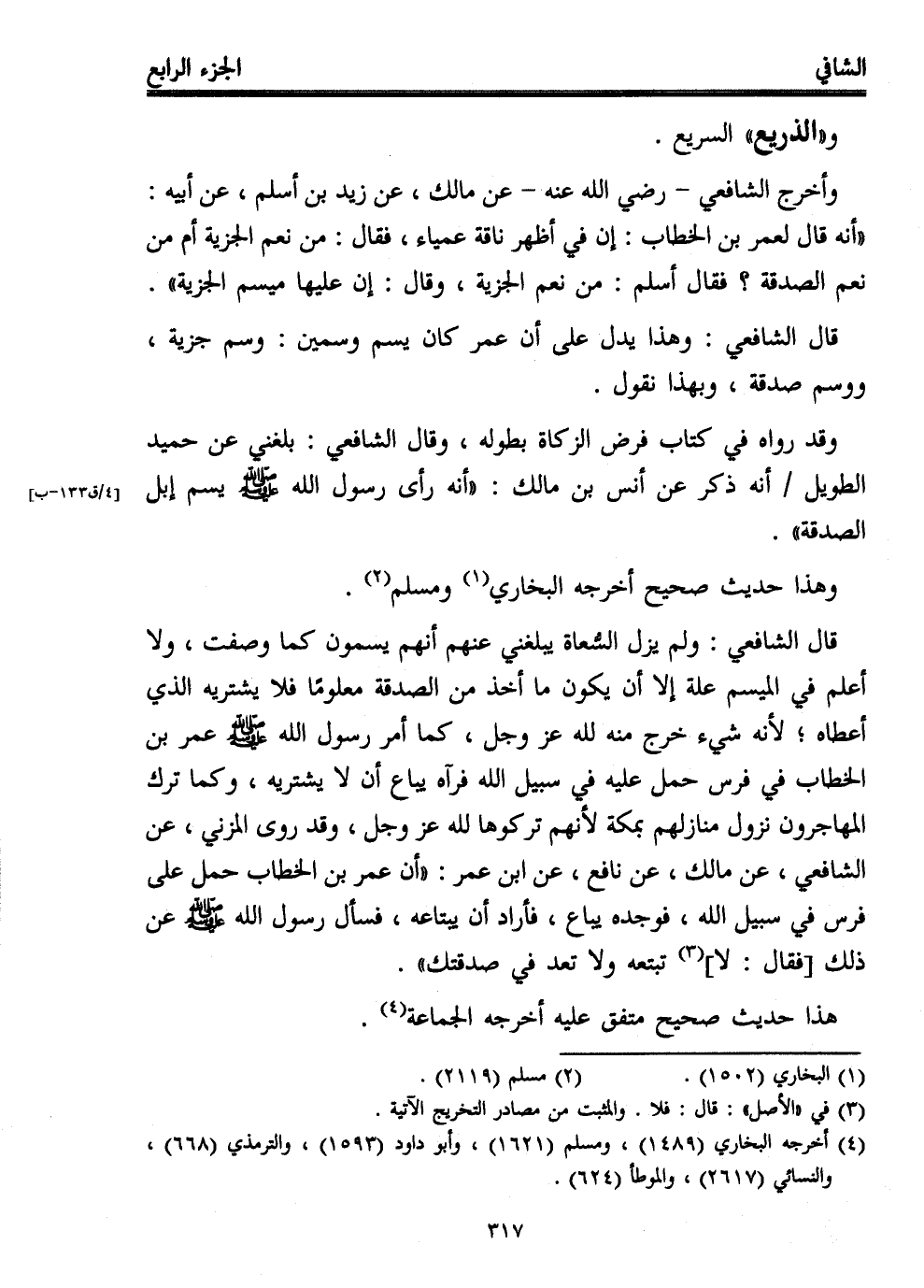 قال الشافعي: ولم يزل السُّعاة يبلغني عنهم أنهم يسمون كما وصفت، ولا أعلم في الميسم علة إلا أن يكون ما أخذ من الصدقة معلومًا فلا يشتريه الذي أعطاه؛ لأنه شيء خرج منه لله عز وجل، كما أمر رسول الله - صلى الله عليه وسلم - عمر بن الخطاب في فرس حمل عليه في سبيل الله فرآه يباع أن لا يشتريه، وكما ترك المهاجرون نزول منازلهم بمكة لأنهم تركوها لله عز وجل، وقد روى المزني، عن الشافعي، عن مالك، عن نافع، عن ابن عمر: "أن عمر بن الخطاب حمل على فرس في سبيل الله، فوجده يباع، فأراد أن يبتاعه، فسأل رسول الله - صلى الله عليه وسلم - عن ذلك [فقال: لا] (¬3) تبتعه ولا تعد في صدقتك".