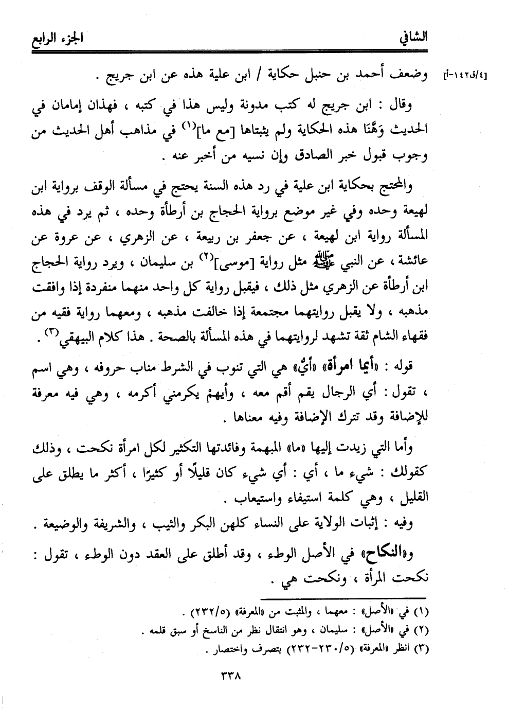 والمحتج بحكاية ابن علية في رد هذه السنة يحتج في مسألة الوقف برواية ابن لهيعة وحده وفي غير موضع برواية الحجاج بن أرطاة وحده، ثم يرد في هذه المسألة رواية ابن لهيعة، عن جعفر بن ربيعة، عن الزهري، عن عروة عن عائشة، عن النبي - صلى الله عليه وسلم - مثل رواية [موسى] (¬2) بن سليمان، ويرد رواية الحجاج ابن أرطأة عن الزهري مثل ذلك، فيقبل رواية كل واحد منهما منفردة إذا وافقت مذهبه، ولا يقبل روايتهما مجتمعة إذا خالفت مذهبه، ومعهما رواية فقيه من فقهاء الشام ثقة تشهد لروايتهما في هذه المسألة بالصحة. هذا كلام البيهقي (¬3).