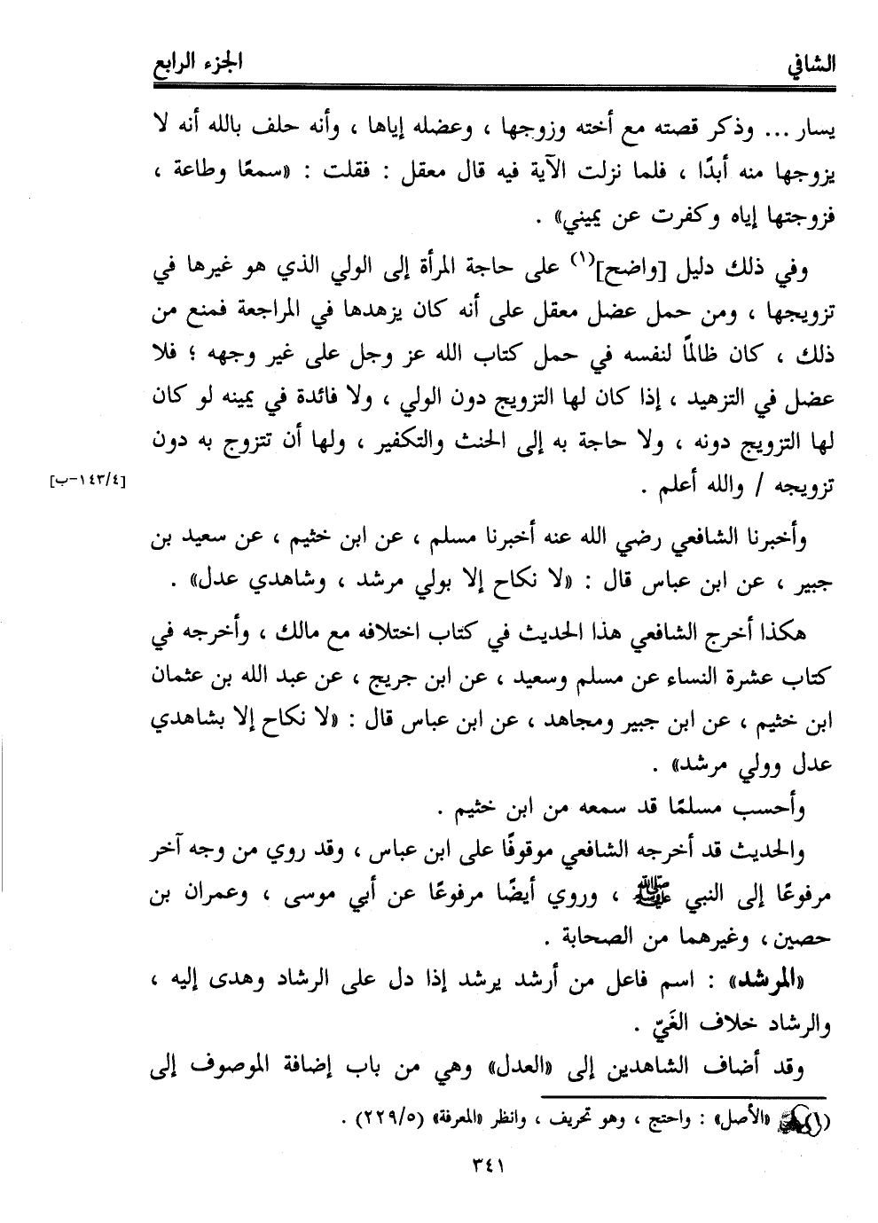 وأخبرنا الشافعي -رضي الله عنه- أخبرنا مسلم، عن ابن خثيم، عن سعيد بن جبير، عن ابن عباس قال: "لا نكاح إلا بولي مرشد، وشاهدي عدل".