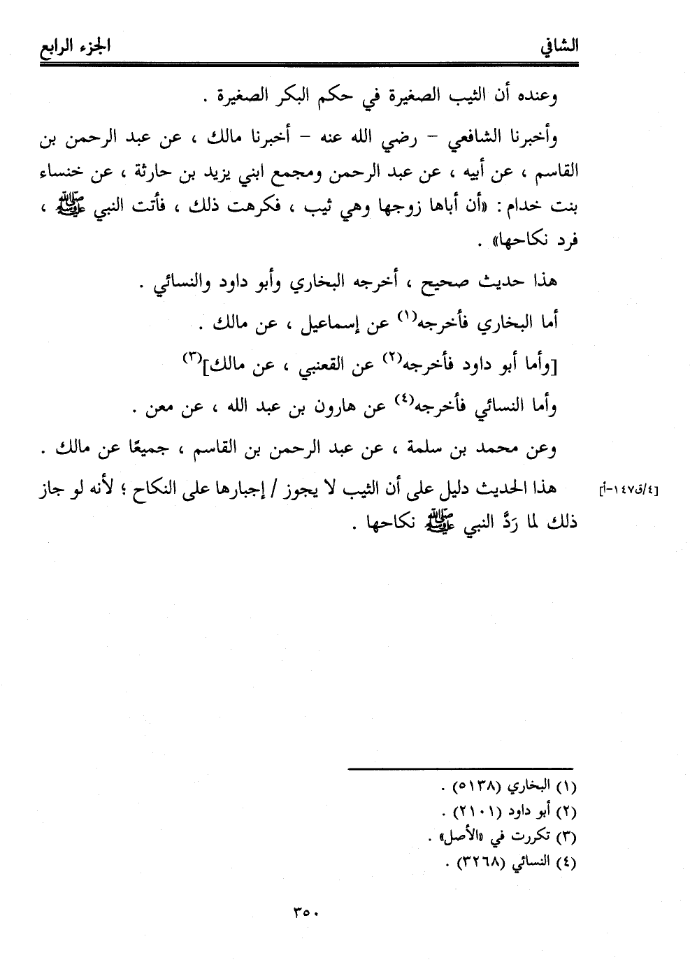 وأخبرنا الشافعي -رضي الله عنه- أخبرنا مالك، عن عبد الرحمن بن القاسم، عن أبيه، عن عبد الرحمن ومجمع ابني يزيد بن حارثة، عن خنساء بنت خدام: "أن أباها زوجها وهي ثيب، فكرهت ذلك، فأتت النبي - صلى الله عليه وسلم -، فرد نكاحها".
