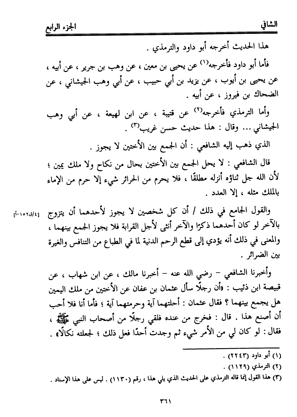 وأخبرنا الشافعي -رضي الله عنه- أخبرنا مالك، عن ابن شهاب، عن قبيصة ابن ذئيب: "أن رجلاً سأل عثمان بن عفان عن الأختين من ملك اليمين هل يجمع بينهما؟ فقال عثمان: أحلتهما آية وحرمتهما آية؛ فأما أنا فلا أحب أن أصنع هذا. قال: فخرج من عنده فلقي رجلاً من أصحاب النبي - صلى الله عليه وسلم -، فقال: لو كان لي من الأمر شيء ثم وجدت أحدًا فعل ذلك؛ لجعلته نكالًا".