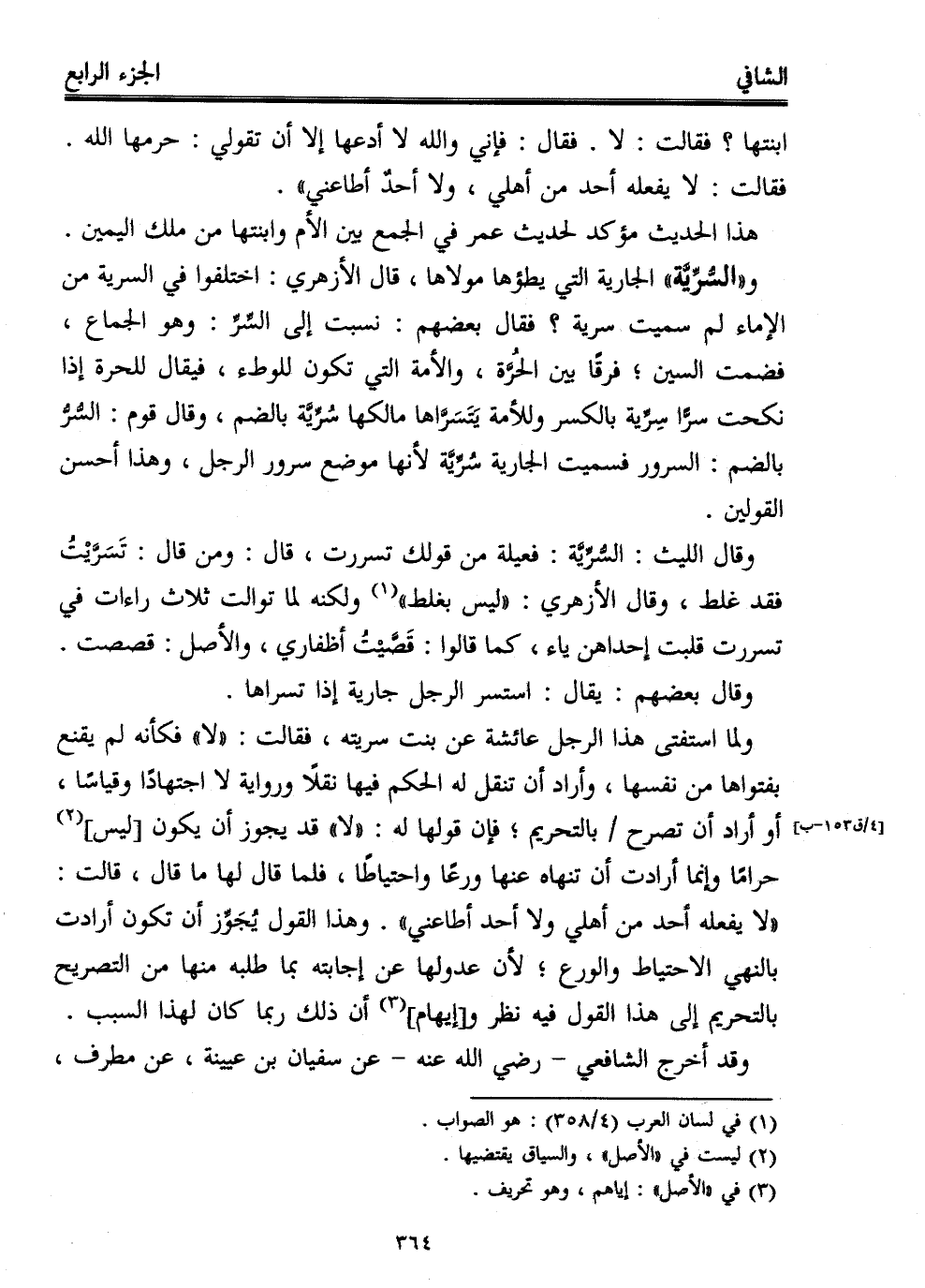 وقال الليث: السُّرِّيَّة: فعيلة من قولك تسررت، قال: ومن قال: تَسَرَّيْتُ فقد غلط، وقال الأزهري: "ليس بغلط" (¬1) ولكنه لما توالت ثلاث راءات في تسررت قلبت إحداهن ياء، كما قالوا: قَصَّيْتُ أظفاري، والأصل: قصصت.