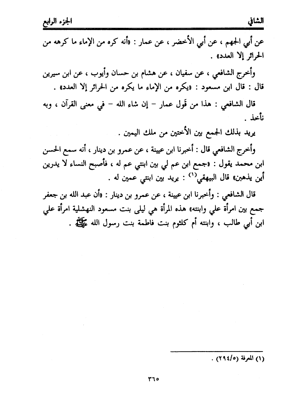 قال الشافعي: وأخبرنا ابن عيينة، عن عمرو بن دينار: أن عبد الله بن جعفر جمع بين امرأة علي وابنته" هذه المرأة هي ليلى بنت مسعود النهشلية امرأة علي ابن أبي طالب، وابنته أم كلثوم بنت فاطمة بنت رسول الله - صلى الله عليه وسلم -.