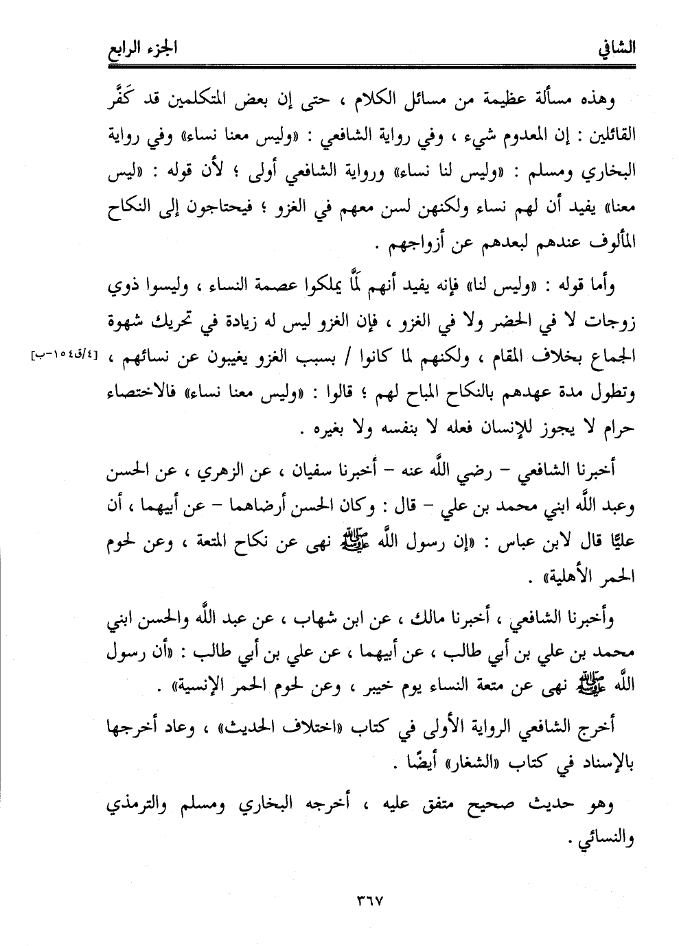 أخبرنا الشافعي -رضي الله عنه- أخبرنا سفيان، عن الزهري، عن الحسن وعبد الله ابني محمد بن علي -قال: وكان الحسن أرضاهما- عن أبيهما، أن عليًّا قال لابن عباس: "إن رسول الله - صلى الله عليه وسلم - نهى عن نكاح المتعة، وعن لحوم الحمر الأهلية".