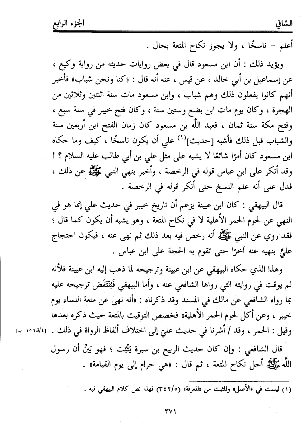 ويؤيد ذلك: أن ابن مسعود قال في بعض روايات حديثه من رواية وكيع، عن إسماعيل بن أبي خالد، عن قيس، عنه أنه قال: "كنا ونحن شباب" فأخبر أنهم كانوا يفعلون ذلك وهم شباب، وابن مسعود مات سنة اثنتين وثلاثين من الهجرة، وكان يوم مات ابن بضع وستين سنة، وكان فتح خيبر في سنة سبع، وفتح مكة سنة ثمان، فعبد الله بن مسعود كان زمان الفتح ابن أربعين سنة والشباب قبل ذلك فأشبه [حديث] (¬1) علي أن يكون ناسخًا، كيف وما حكاه ابن مسعود كان أمرًا شائعًا لا يشبه على مثل علي بن أبي طالب عليه السلام؟! وقد أنكر على ابن عباس قوله في الرخصة، وأخبر بنهي النبي - صلى الله عليه وسلم - عن ذلك، فدل على أنه علم النسخ حتى أنكر قوله في الرخصة.