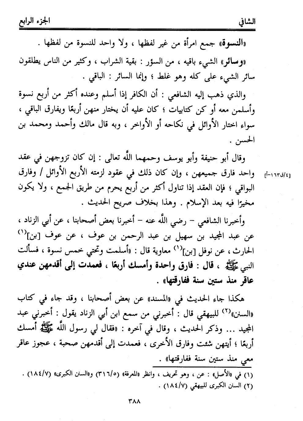 هكذا جاء الحديث في "المسند" عن بعض أصحابنا، وقد جاء في كتاب "السنن" (¬2) للبيهقي قال: أخبرني من سمع ابن أبي الزناد يقول: أخبرني عبد المجيد ... وذكر الحديث، وقال في آخره: "فقال لي رسول الله - صلى الله عليه وسلم - أمسك أربعًا؛ أيتهن شئت وفارق الأخرى، فعمدت إلى أقدمهن صحبة، عجوز عاقر معي منذ ستين سنة ففارقتها".