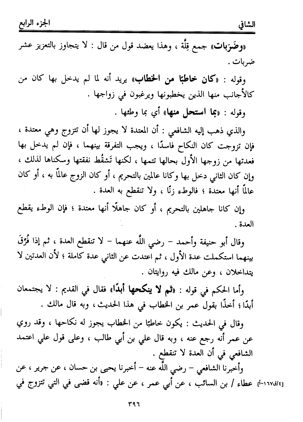 وقال في الحديث: يكون خاطبًا من الخطاب يجوز له نكاحها، وقد روي عن عمر أنه رجع عنه، وبه قال علي بن أبي طالب، وعلى قول علي اعتمد الشافعي في أن العدة لا تنقطع.
