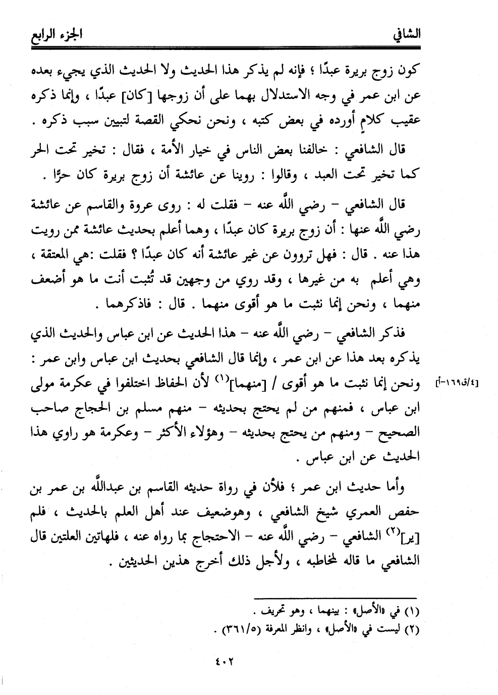 قال الشافعي -رضي الله عنه- فقلت له: روى عروة والقاسم عن عائشة -رضي الله عنها-: أن زوج بريرة كان عبدًا، وهما أعلم بحديث عائشة ممن رويت هذا عنه. قال: فهل تروون عن غير عائشة أنه كان عبدًا؟ فقلت: هي المعتقة، وهي أعلم به من غيرها، وقد روي من وجهين قد تُثبت أنت ما هو أضعف منهما، ونحن إنما نثبت ما هو أقوى منهما. قال: فاذكرهما.