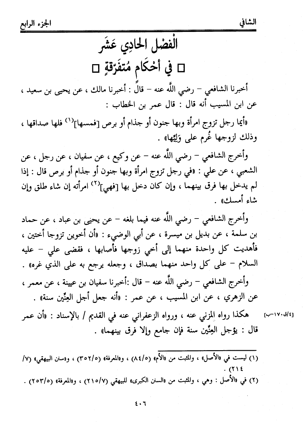 وأخرج الشافعي -رضي الله عنه- قال: أخبرنا سفيان بن عيينة، عن معمر، عن الزهري، عن ابن المسيب، عن عمر: "أنه جعل أجل العِنِّين سنة".