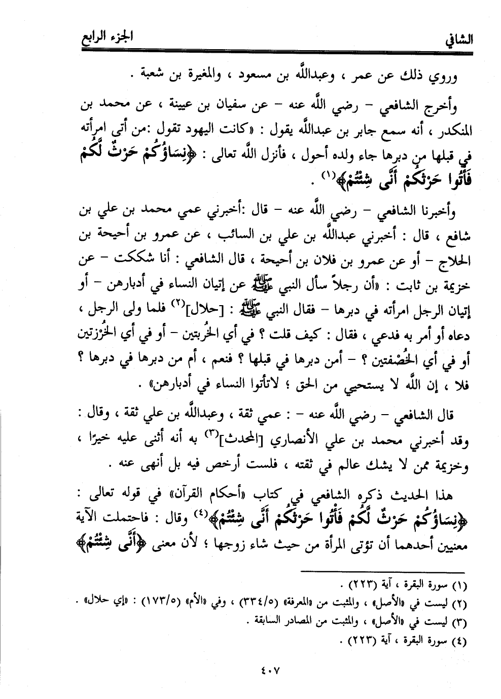 وأخرج الشافعي -رضي الله عنه- عن سفيان بن عيينة، عن محمد بن المنكدر، أنه سمع جابر بن عبد الله يقول: "كانت اليهود تقول: من أتي امرأته في قبلها من دبرها جاء ولده أحول، فأنزل الله تعالى: {نِسَاؤُكُمْ حَرْثٌ لَكُمْ فَأْتُوا حَرْثَكُمْ أَنَّى شِئْتُمْ} (¬1).