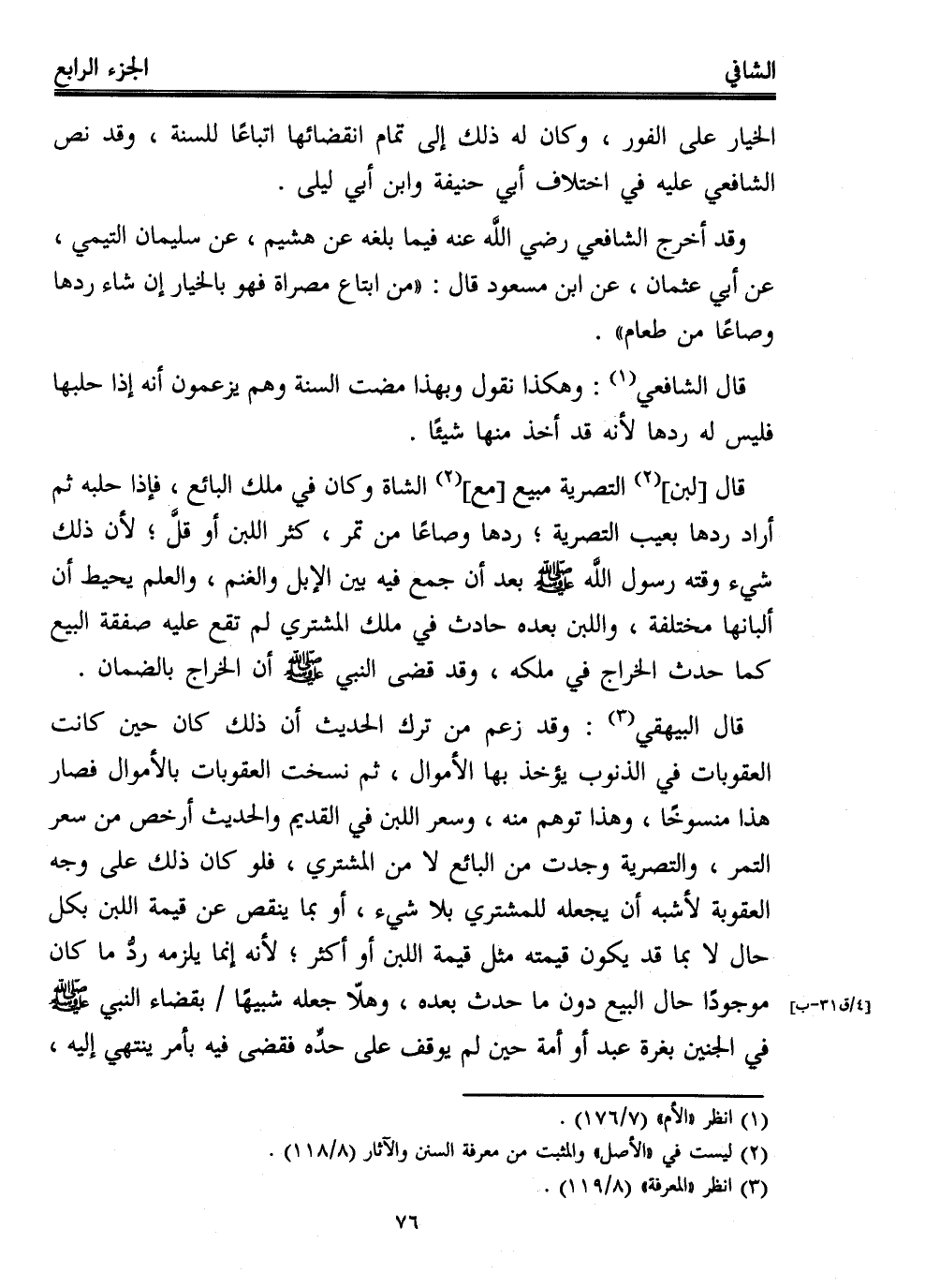 قال البيهقي (¬3): وقد زعم من ترك الحديث أن ذلك كان حين كانت العقوبات في الذنوب يؤخذ بها الأموال، ثم نسخت العقوبات بالأموال فصار هذا منسوخًا، وهذا توهم منه، وسعر اللبن في القديم والحديث أرخص من سعر التمر، والتصرية وجدت من البائع لا من المشتري، فلو كان ذلك على وجه العقوبة لأشبه أن يجعله للمشتري بلا شيء، أو بما ينقص عن قيمة اللبن بكل حال لا بما قد يكون قيمته مثل قيمة اللبن أو أكثر؛ لأنه إنما يلزمه ردُّ ما كان موجودًا حال البيع دون ما حدث بعده، وهلّا جعله شبيهًا بقضاء النبي - صلى الله عليه وسلم - في الجنين بغرة عبد أو أمة حين لم يوقف على حدِّه فقضى فيه بأمر ينتهي إليه،