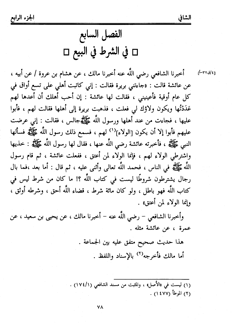 أخبرنا الشافعي -رضي الله عنه- أخبرنا مالك، عن هشام بن عروة عن أبيه، عن عائشة قالت: "جاءتني بريرة فقالت: إني كاتبت أهلي على تسع أواق في كل عام أوقية فأعينيني، فقالت لها عائشة: إن أحب أهلك أن أعدها لهم عَدَدْتُها ويكون ولاؤك لي فعلت، فذهبت بريرة إلى أهلها فقالت لهم، فأبوا عليها، فجاءت من عند أهلها ورسول الله - صلى الله عليه وسلم - جالس، فقالت: إني عرضت عليهم فأبوا إلا أن يكون [الولاء] (¬1) لهم، فسمع ذلك رسول الله - صلى الله عليه وسلم - فسألها النبي - صلى الله عليه وسلم -، فأخبرته عائشة -رضي الله عنها-، فقال لها رسول الله - صلى الله عليه وسلم -: خذيها واشترطي الولاء لهم، فإنما الولاء لمن أعتق، ففعلت عائشة، ثم قام رسول الله - صلى الله عليه وسلم - في الناس، فحمد الله تعالى وأثنى عليه، ثم قال: أما بعد، فما بال رجال يشترطون شروطًا ليست في كتاب الله؟! ما كان من شرط ليس في كتاب الله فهو باطل، ولو كان مائة شرط، قضاء الله أحق، وشرطه أوثق، وإنما الولاء لمن أعتق".