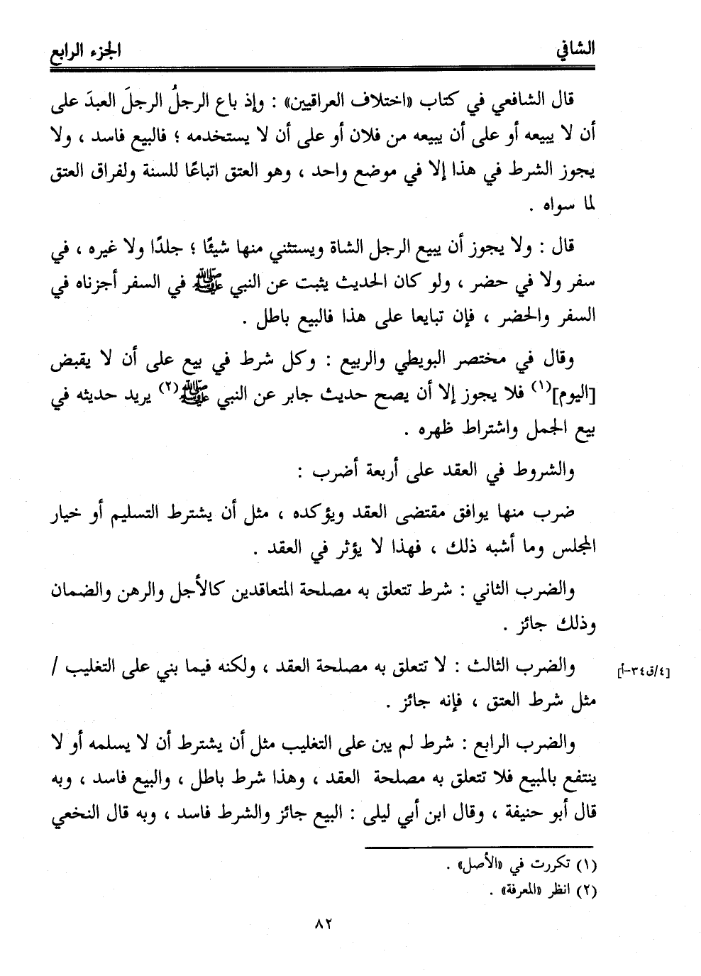 قال الشافعي في كتاب "اختلاف العراقيين": وإذ باع الرجلُ الرجلَ العبدَ على أن لا يبيعه أو على أن يبيعه من فلان أو على أن لا يستخدمه؛ فالبيع فاسد، ولا يجوز الشرط في هذا إلا في موضع واحد، وهو العتق اتباعًا للسنة ولفراق العتق لما سواه.