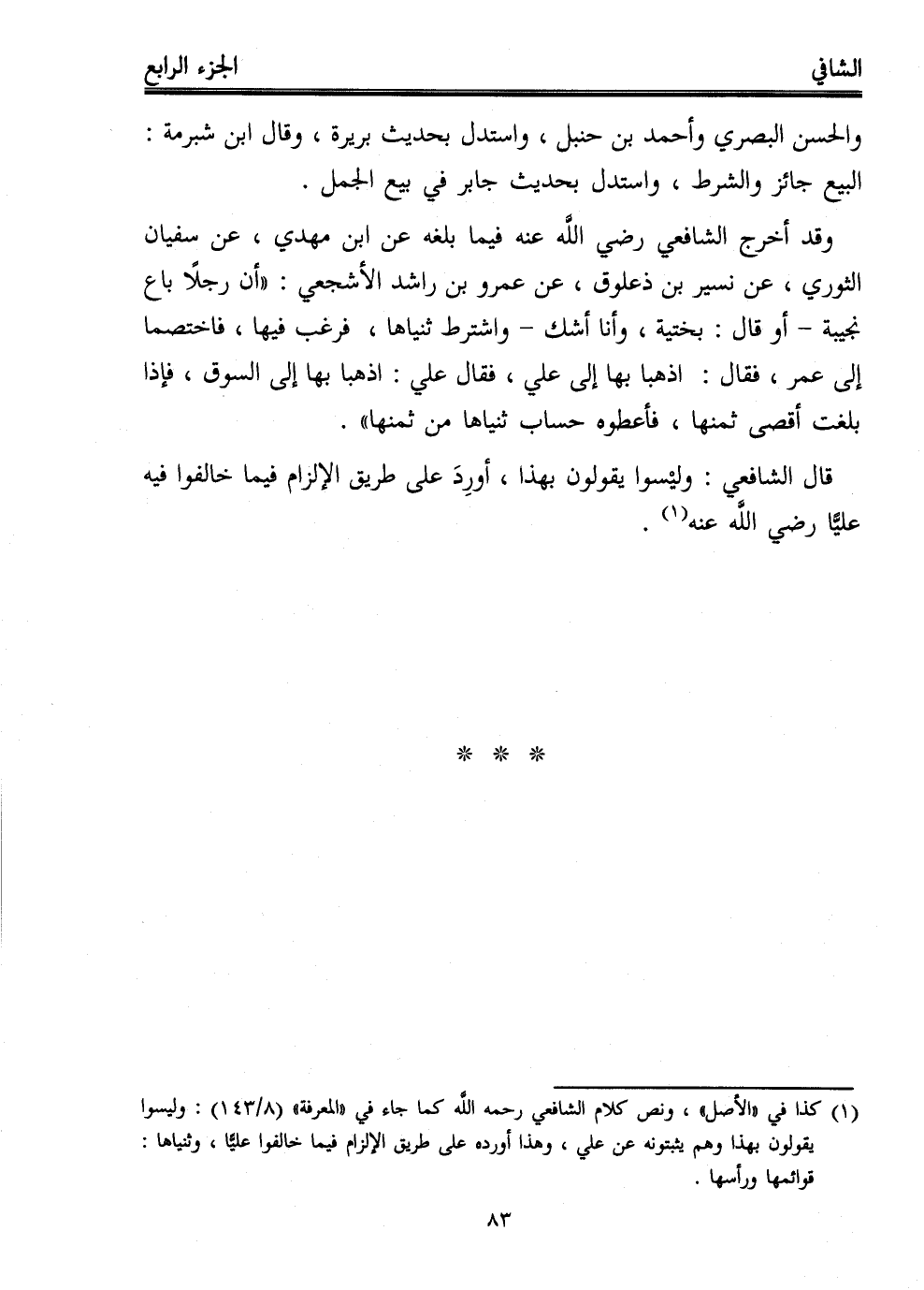 وقد أخرج الشافعي -رضي الله عنه- فيما بلغه عن ابن مهدي، عن سفيان الثوري، عن نسير بن ذعلوق، عن عمرو بن راشد الأشجعي: "أن رجلاً باع نجيبة -أو قال: بختية، وأنا أشك- واشترط ثنياها، فرغب فيها، فاختصما إلى عمر، فقال: اذهبا بها إلى علي، فقال علي: اذهبا بها إلى السوق، فإذا بلغت أقصى ثمنها، فأعطوه حساب ثنياها من ثمنها".