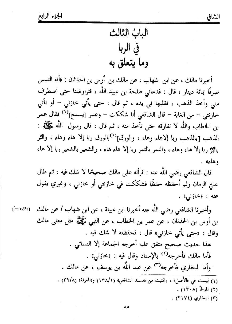 وأخبرنا الشافعي -رضي الله عنه- أخبرنا ابن عيينة، عن ابن شهاب عن مالك بن أوس بن الحدثان، عن عمر بن الخطاب، عن النبي - صلى الله عليه وسلم - مثل معنى مالك وقال: "حتى يأتي خازني" قال: فحفظته لا شك فيه.