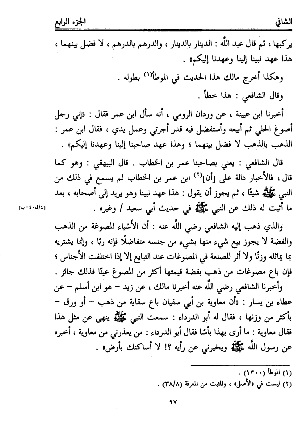 وأخبرنا الشافعي -رضي الله عنه- أخبرنا مالك، عن زيد -هو ابن أسلم- عن عطاء بن يسار: "أن معاوية بن أبي سفيان باع سقاية من ذهب -أو ورق- بأكثر من وزنها، فقال له أبو الدرداء: سمعت النبي - صلى الله عليه وسلم - ينهى عن مثل هذا فقال معاوية: ما أرى بهذا بأسًا فقال أبو الدرداء: من يعذرني من معاوية، أخبره عن رسول الله - صلى الله عليه وسلم - ويخبرني عن رأيه؟! لا أساكنك بأرض".