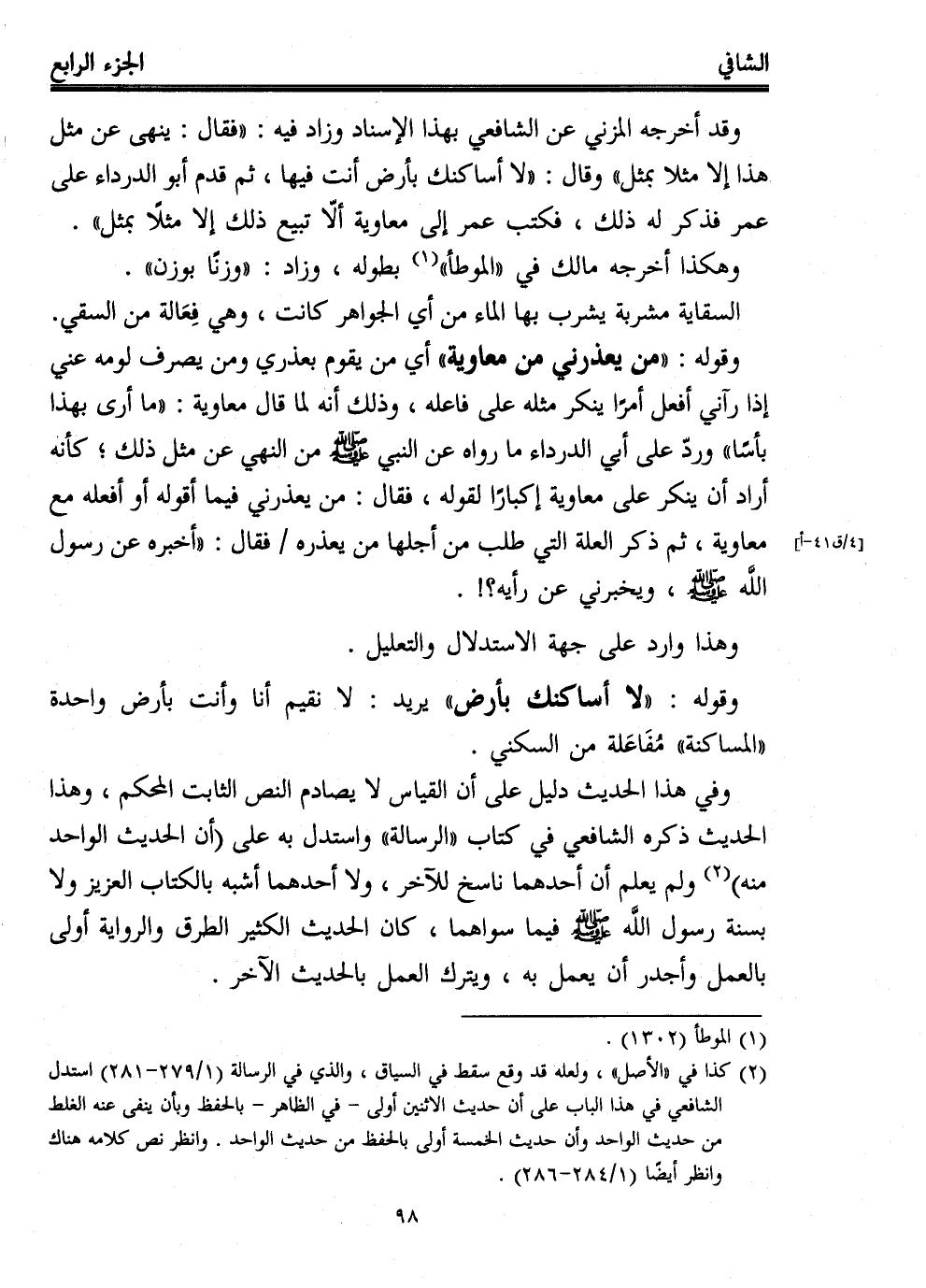وقد أخرجه المزني عن الشافعي بهذا الإسناد وزاد فيه: "فقال: ينهى عن مثل هذا إِلا مثلا بمثل" وقال: "لا أساكنك بأرض أنت فيها، ثم قدم أبو الدرداء على عمر فذكر له ذلك، فكتب عمر إلى معاوية ألّا تبيع ذلك إلا مثلًا بمثل".