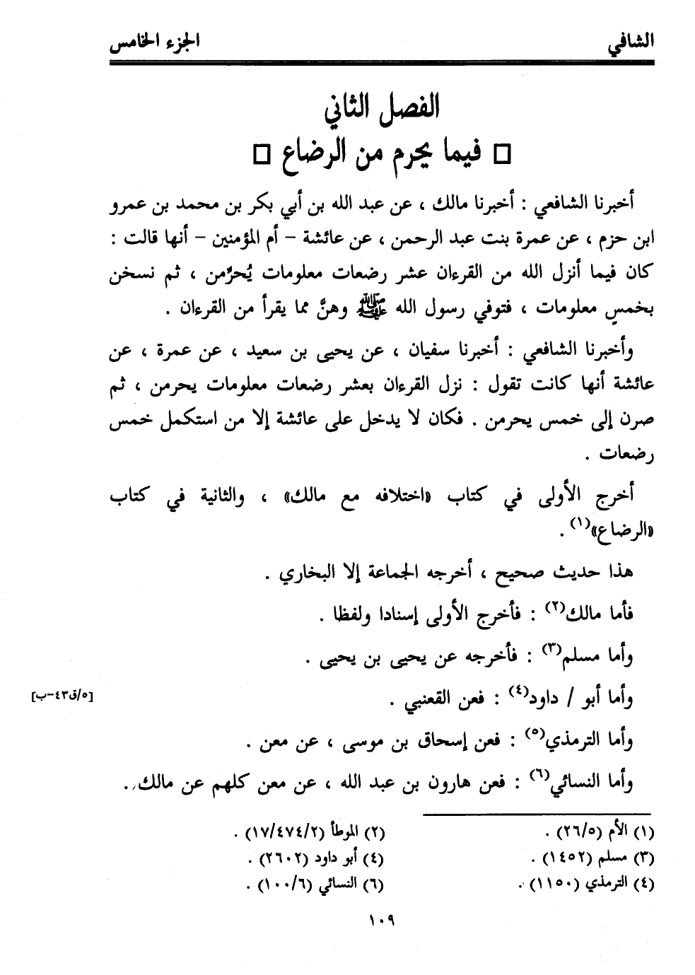 أخبرنا الشافعي: أخبرنا مالك، عن عبد الله بن أبي بكر بن محمد بن عمرو ابن حزم، عن عمرة بنت عبد الرحمن، عن عائشة -أم المؤمنين- أنها قالت: كان فيما أنزل الله من القرءان عشر رضعات معلومات يُحرِّمن، ثم نسخن بخمسٍ معلومات، فتوفي رسول الله - صلى الله عليه وسلم - وهنَّ مما يقرأ من القرءان.