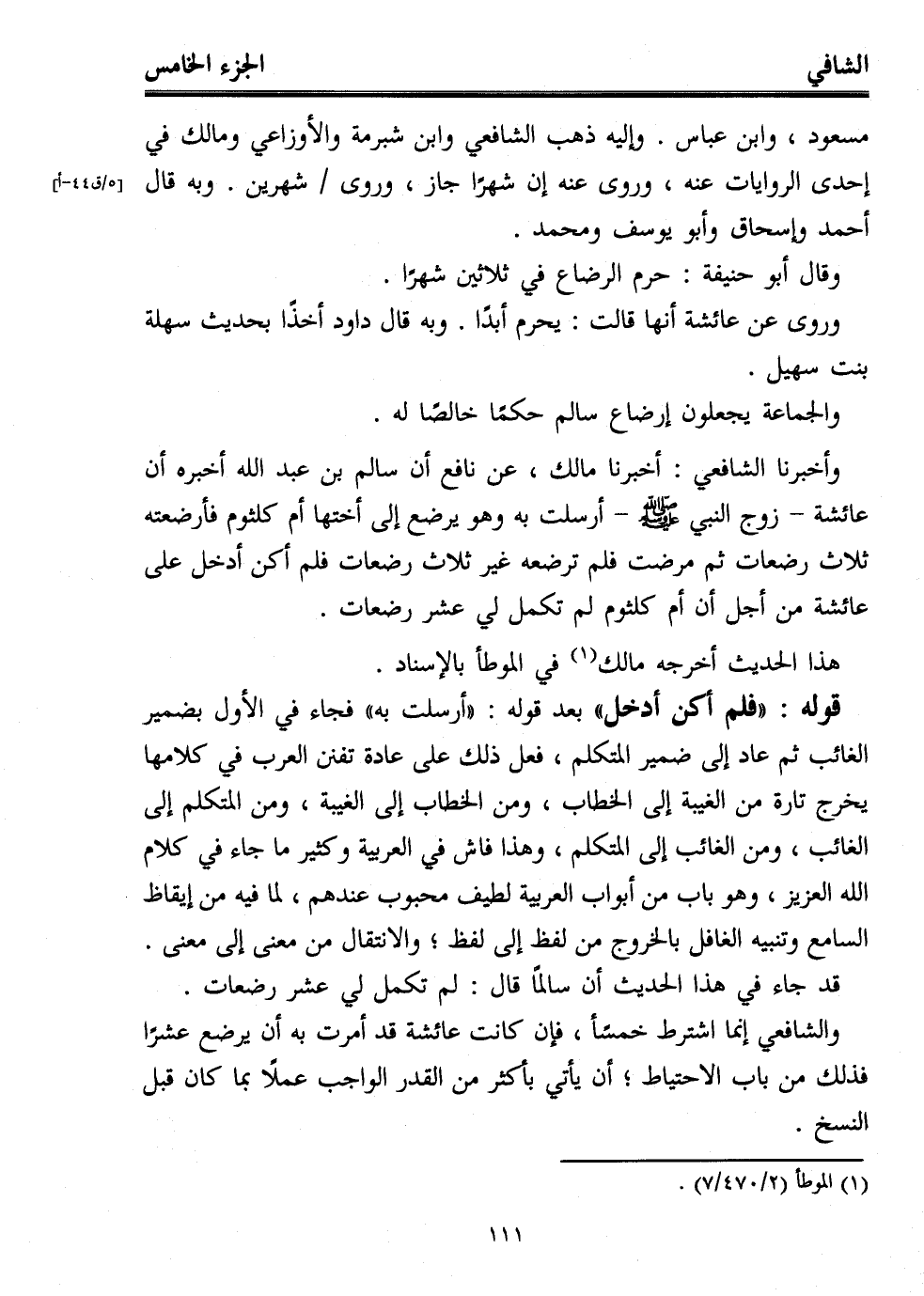 وأخبرنا الشافعي: أخبرنا مالك، عن نافع أن سالم بن عبد الله أخبره أن عائشة -زوج النبي - صلى الله عليه وسلم- أرسلت به وهو يرضع إلى أختها أم كلثوم فأرضعته ثلاث رضعات ثم مرضت فلم ترضعه غير ثلاث رضعات فلم أكن أدخل على عائشة من أجل أن أم كلثوم لم تكمل لي عشر رضعات.