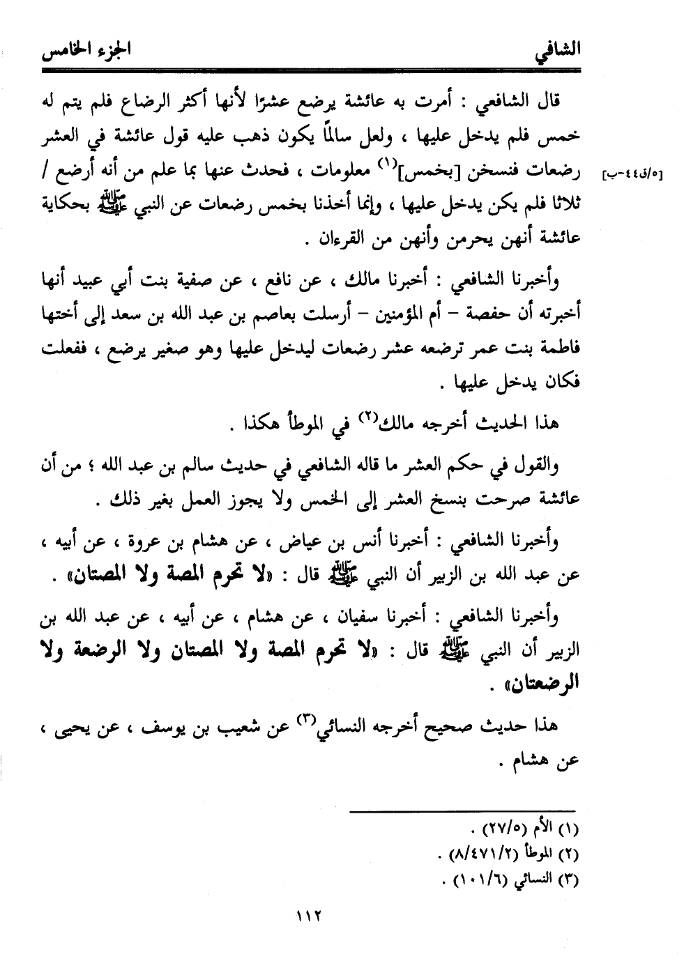 وأخبرنا الشافعي: أخبرنا سفيان، عن هشام، عن أبية، عن عبد الله بن الزبير أن النبي - صلى الله عليه وسلم - قال: "لا تحرم المصة ولا المصتان ولا الرضعة ولا الرضعتان".