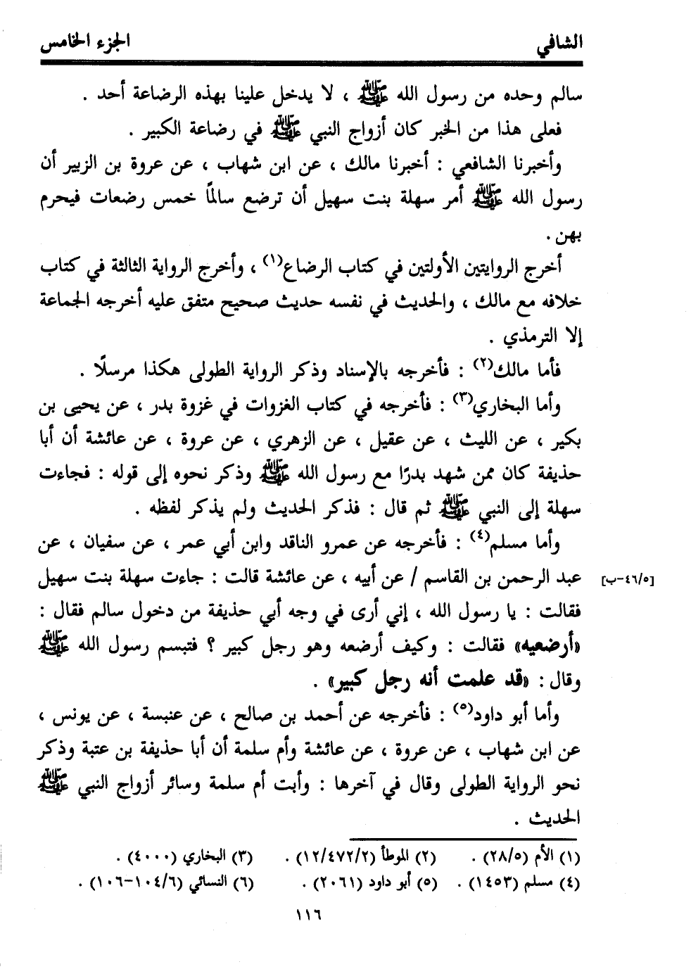 وأخبرنا الشافعي: أخبرنا مالك، عن ابن شهاب، عن عروة بن الزبير أن رسول الله - صلى الله عليه وسلم - أمر سهلة بنت سهيل أن ترضع سالمًا خمس رضعات فيحرم بهن.