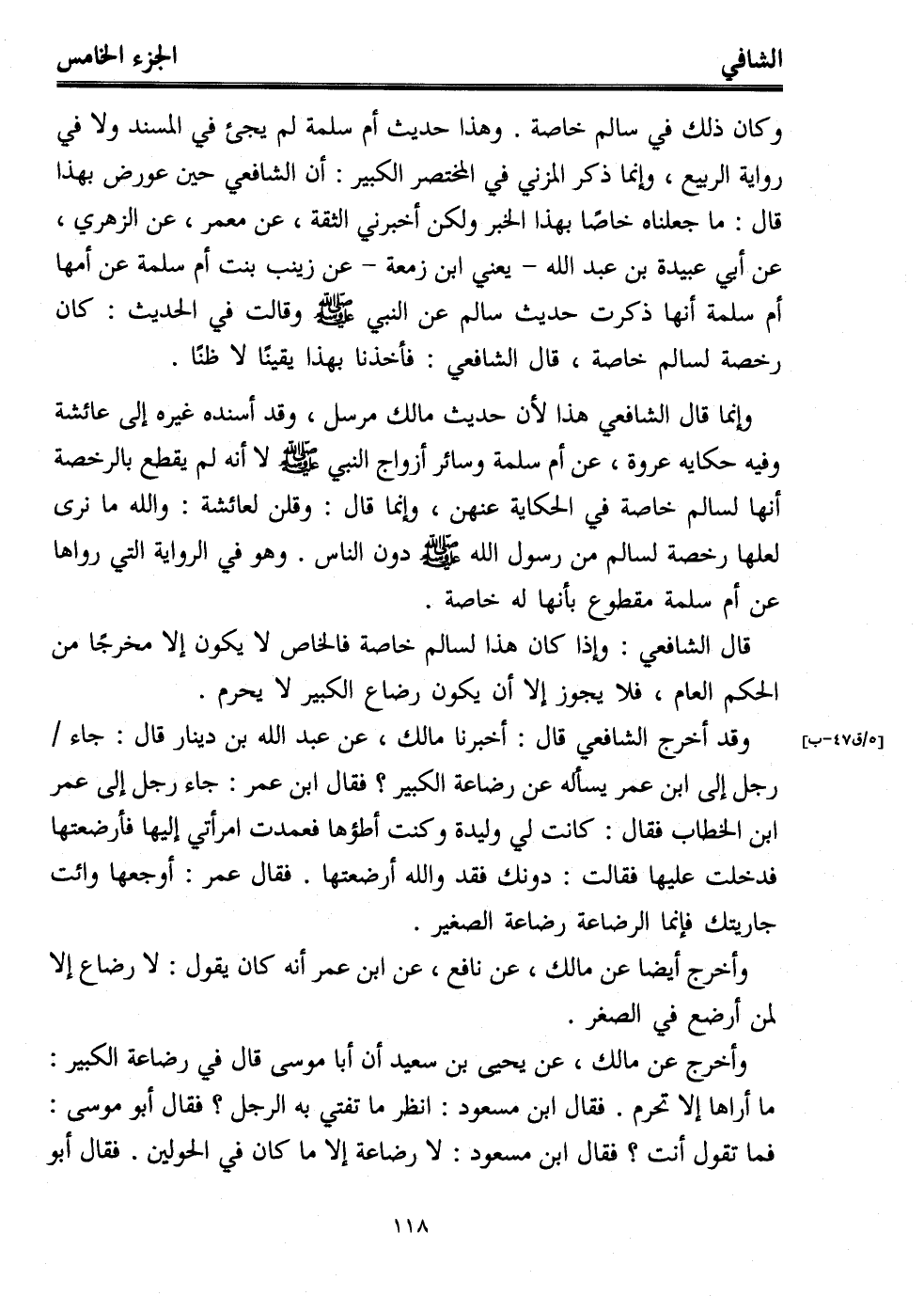 وقد أخرج الشافعي قال: أخبرنا مالك، عن عبد الله بن دينار قال: جاء رجل إلى ابن عمر يسأله عن رضاعة الكبير؟ فقال ابن عمر: جاء رجل إلى عمر ابن الخطاب فقال: كانت لي وليدة وكنت أطؤها فعمدت امرأتي إليها فأرضعتها فدخلت عليها فقالت: دونك فقد والله أرضعتها. فقال عمر: أوجعها وائت جاريتك فإنما الرضاعة رضاعة الصغير.